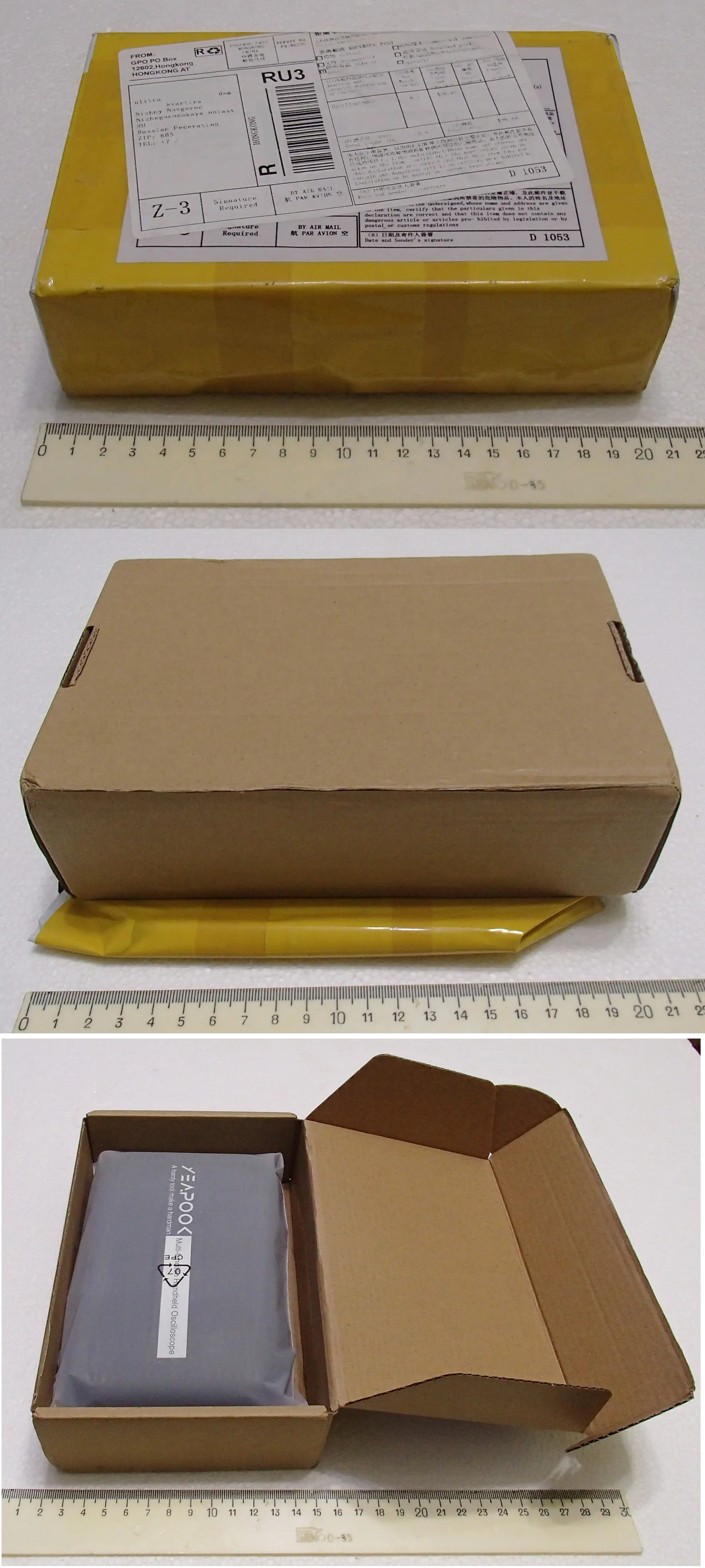 Доставка 22 дня, Новой почтой. Упаковка отличная, Пакет, коробка картонная и кейс с осциллографом. Включил, работает, но пока не проверял подробно. Кейс удобный для хранения и транспортировки. Хорошие впечатления.