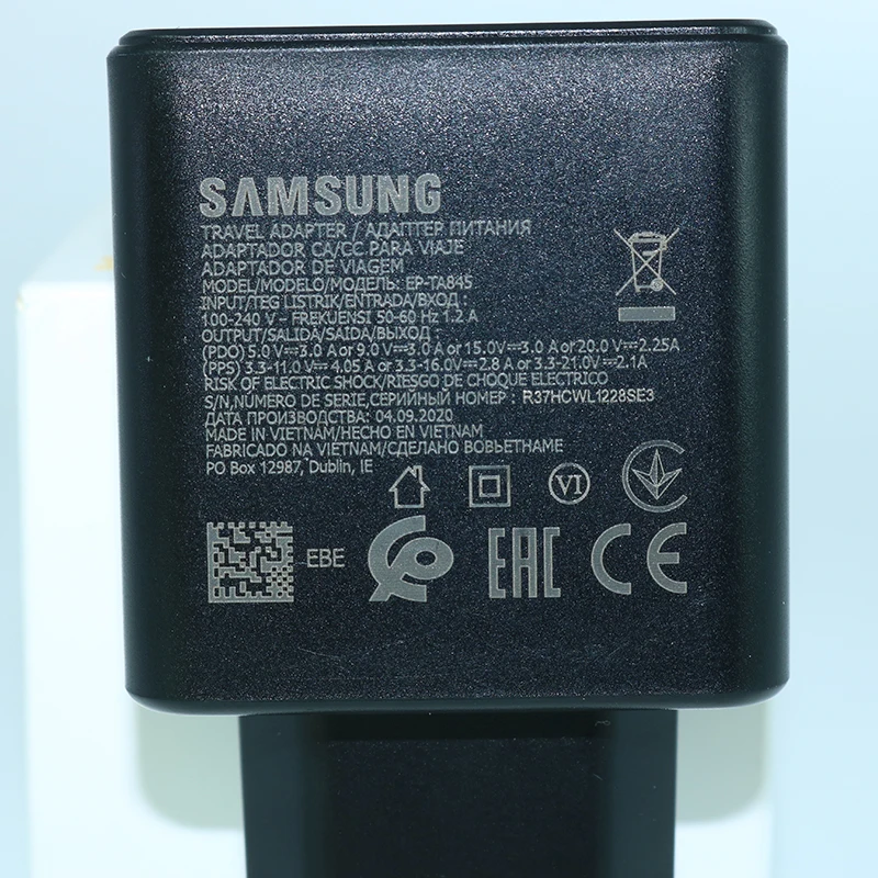 Характеристики Товара: 100% оригиналНазвание продукта: супер быстрое зарядное устройство (интерфейс Type-C)Модель зарядного устройства: EP-TA845Интерфейс: USB Type-CВход: 100-240 В переменного тока 50-60 Гц 1.2A(PDO): 5,0 V-3.0A или 9V-3.0A или 15,0 V-3.0A или 20,0 V-2.25A(PPS) 3,3 ~ 11,0 V-4.05A или 3,3 ~ 16,0 V-2.8A или 3,3 ~ 21,0 V-2.1AДлина кабеля: около 1,0 мХарактеристики и функции: супер ускоренная зарядка до 45 ВтИспользуется во всех интерфейсах Type-C-это мобильные телефоны