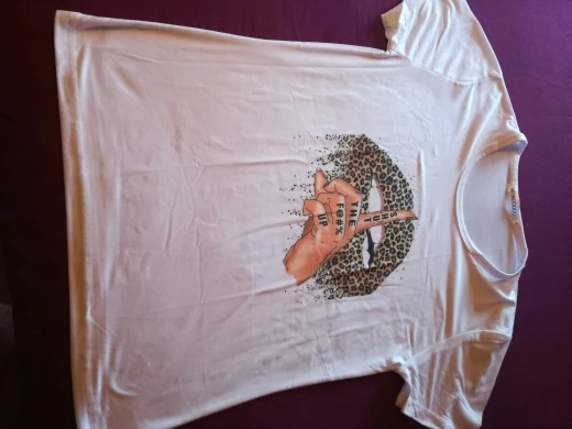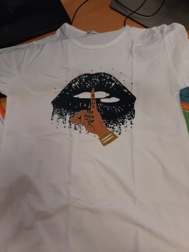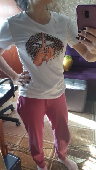 Ну так себе футболка. За 300 рублей большего конечно ожидать не стоило, для дома подойдёт. Материал синтетика, плотная, но нет и намёка хлопок, то есть не держит форму. На таком материале , лет 10 назад (возможно и сейчас) , в фотостудиях печатали принты разные. Рисунок чёткий, яркий, не наклейка. Я заказала М, чтобы было посвободней, но опять же этот материал не держит форму, и того эффекта который нужен я не добилась, просто футболка большего размера. Хорошо тянется. Хорошо сшита. С продавцом не общалась. Доставка 13 дней. Заказ отправлен быстро.
