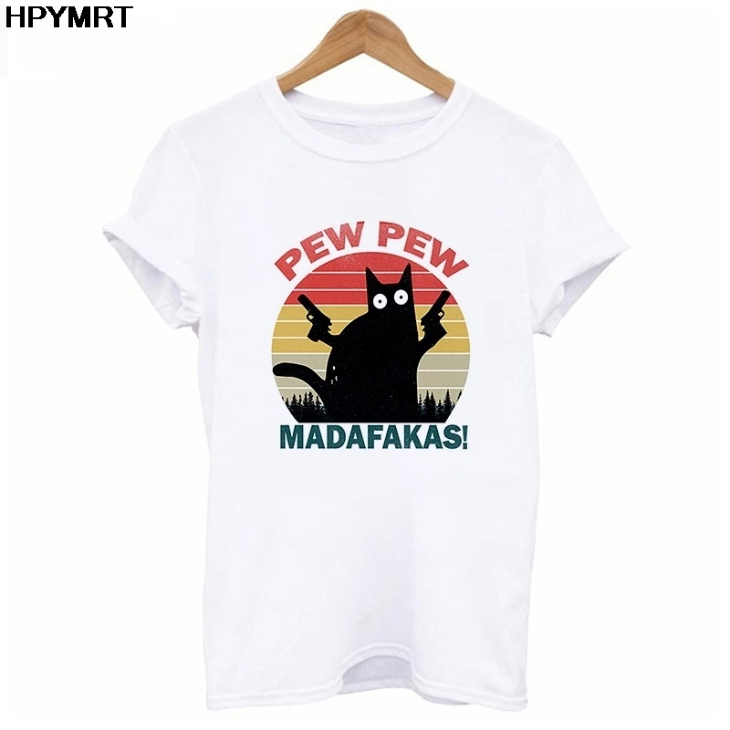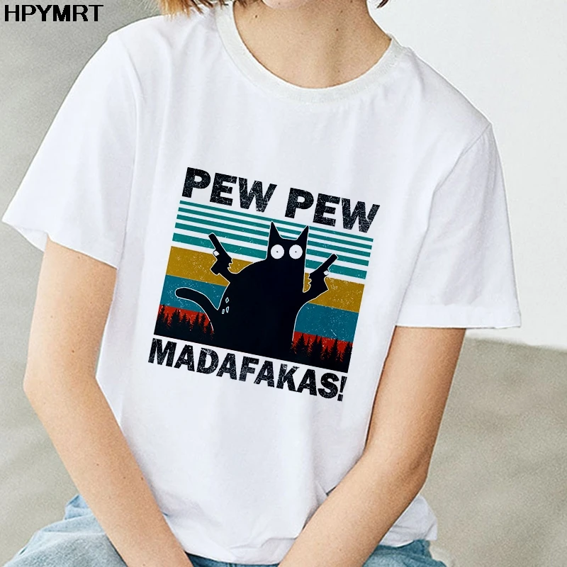 Женская футболка с изображением черного кота Pew Madafakas, забавные летние топы в стиле ретро с изображением кота гангстера и пистолета мема, женская одежда