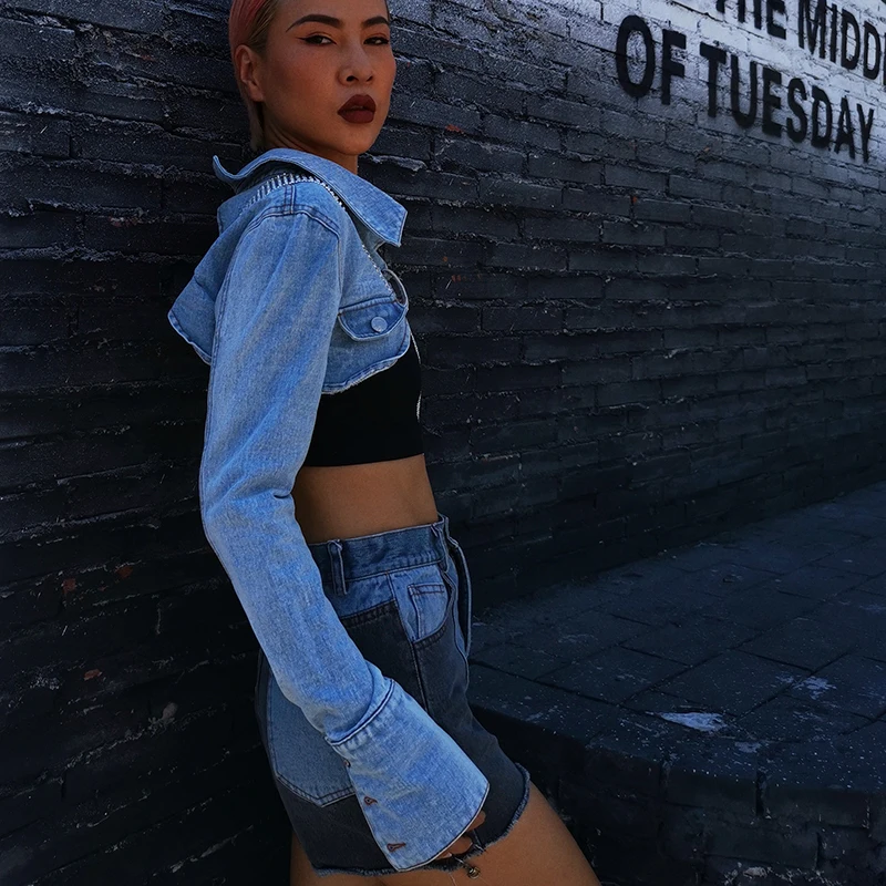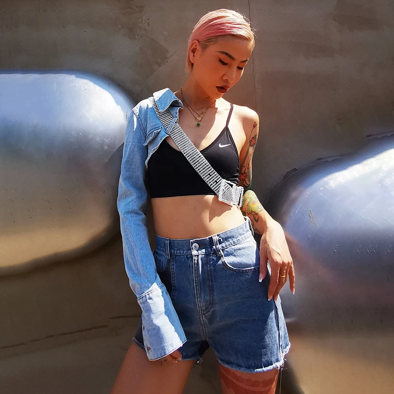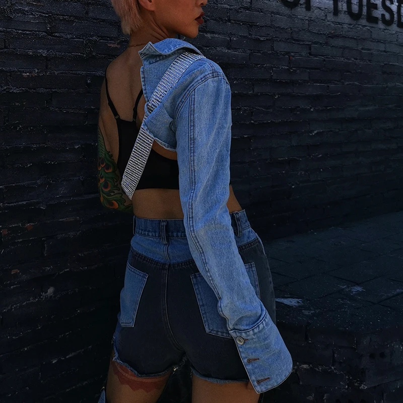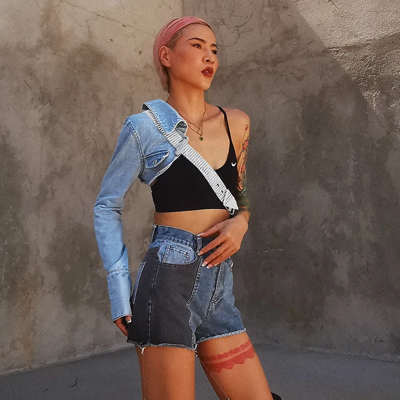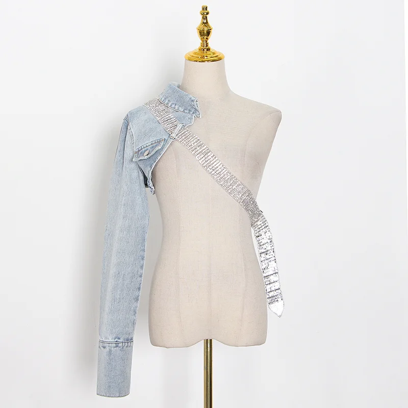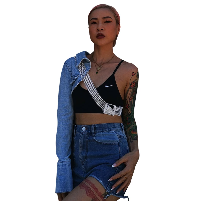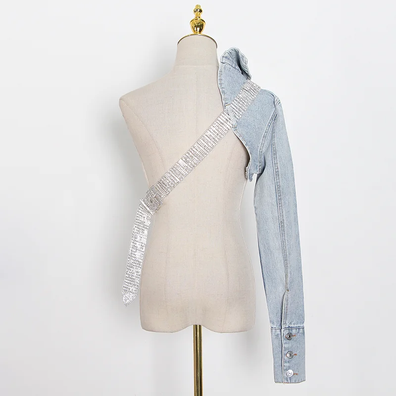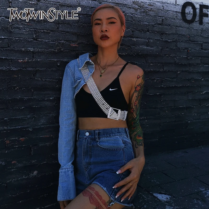 Женская Асимметричная джинсовая куртка TWOTWINSTYLE, с отворотом, длинным рукавом, с бриллиантами, на осень, 2020