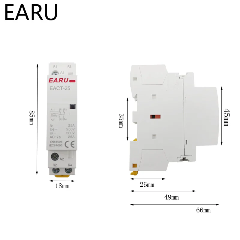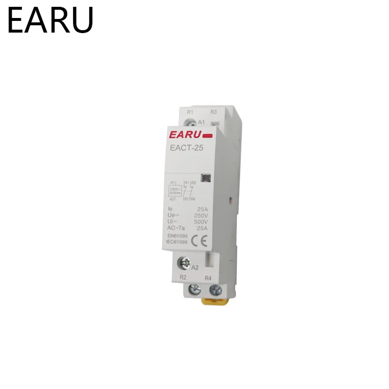 EACT25Контактор переменного тока для дома в Основном предназначен для цепей переменного тока 50 Гц или 60 Гц с 230 В.Номинальное рабочее напряжение в использовании AC7a, Номинальное рабочее напряжение до 230 В, номинальный рабочий ток до 25А, Номинальное рабочее напряжение в использовании AC7b, номинальный ток до 10А. Использование в разрыве мощности ниже 6kA цепи. Для расстояния подключения или прерывания цепи.