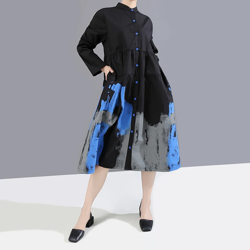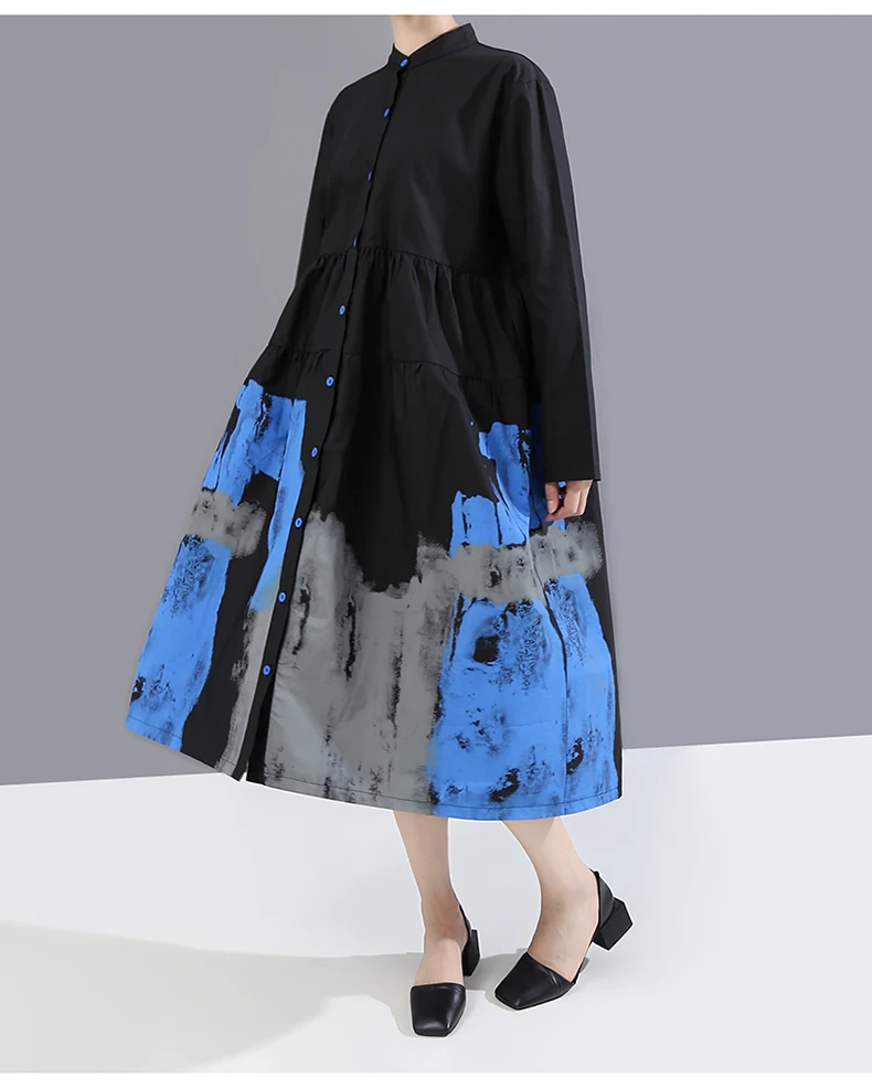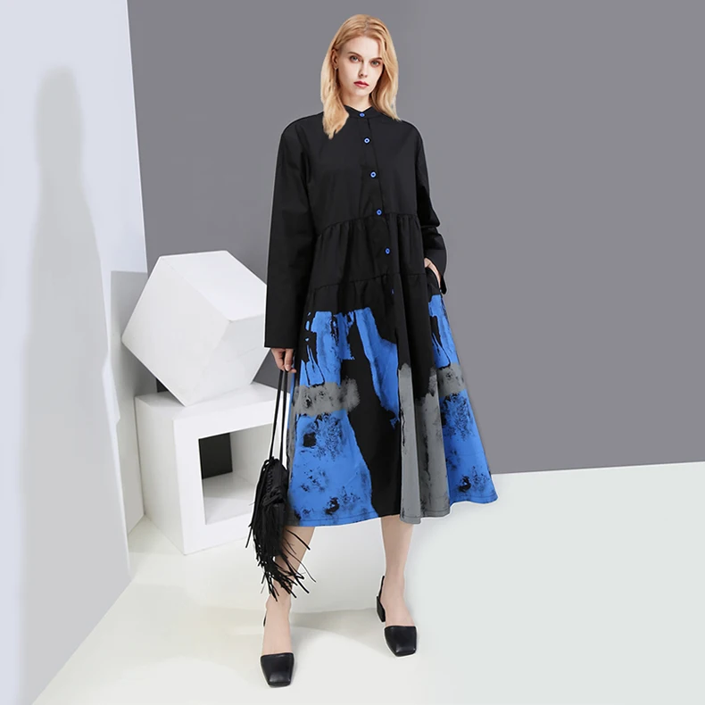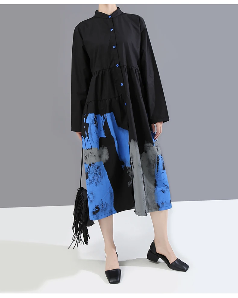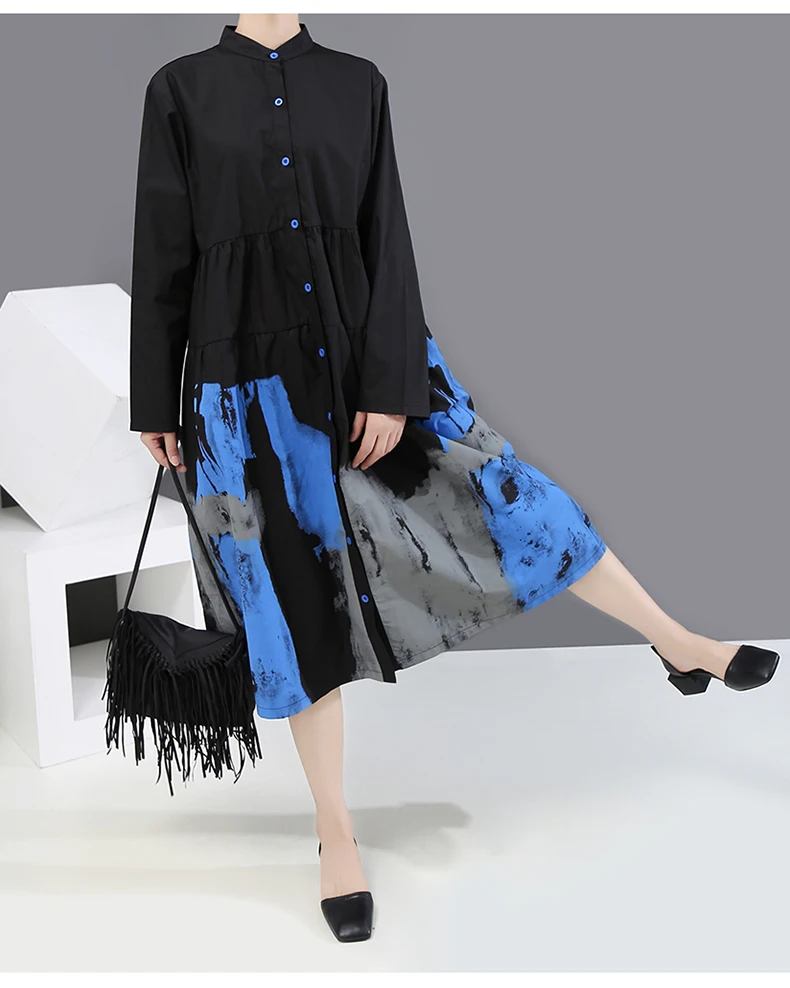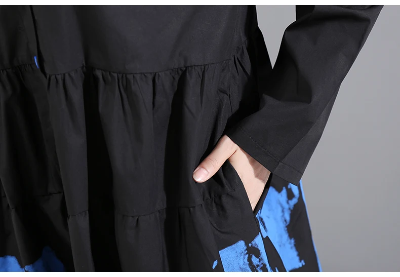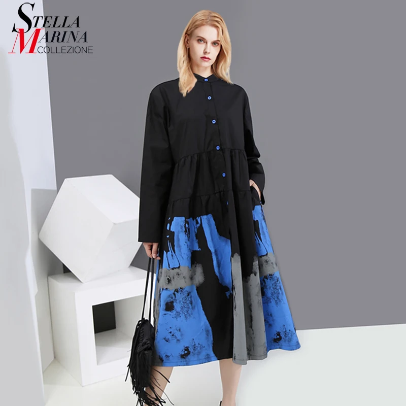 Новинка, модное женское осеннее винтажное платье-рубашка с длинными рукавами и принтом черного и синего цвета, Повседневное платье средней длины с карманами, Robe Femme 6508