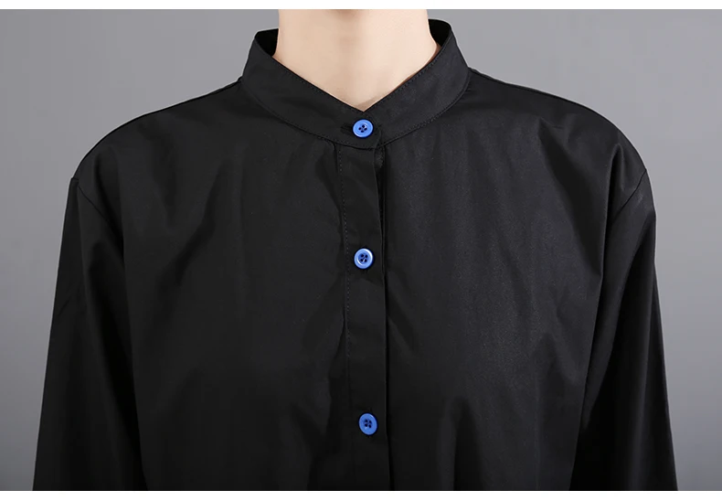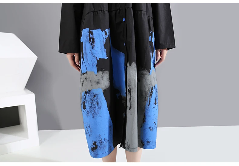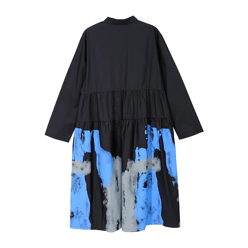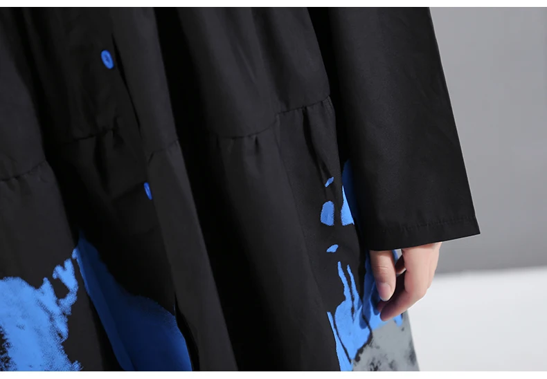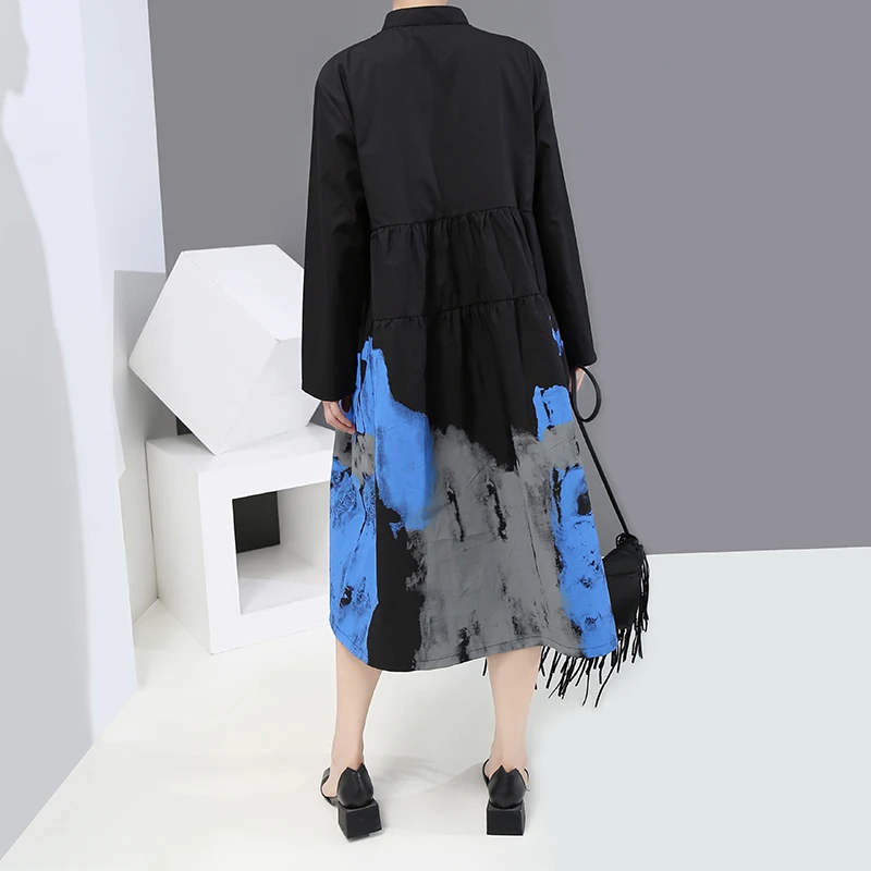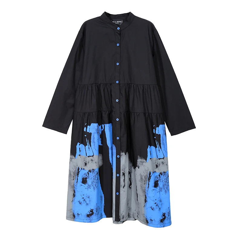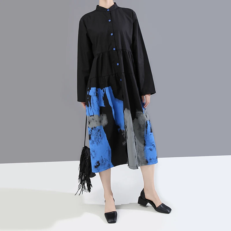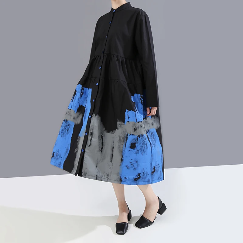 Новинка, модное женское осеннее винтажное платье-рубашка с длинными рукавами и принтом черного и синего цвета, Повседневное платье средней длины с карманами, Robe Femme 6508