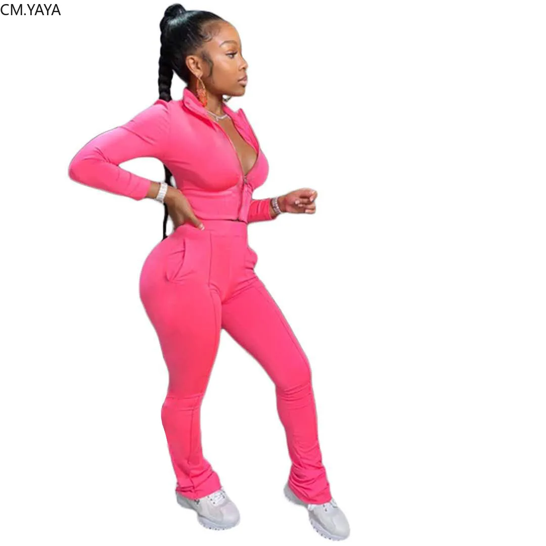 Модный однотонный Женский комплект из двух предметов CM.YAYA, куртка с высокой талией, брюки-джоггеры, спортивный костюм, спортивный костюм, подходящий комплект одежды