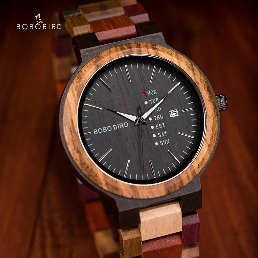 Мужские деревянные многофункциональные наручные часы BOBO BIRD, автоматическое отображение даты и недели, Модный Цветной ремешок, мужские часы, часы для мужчин