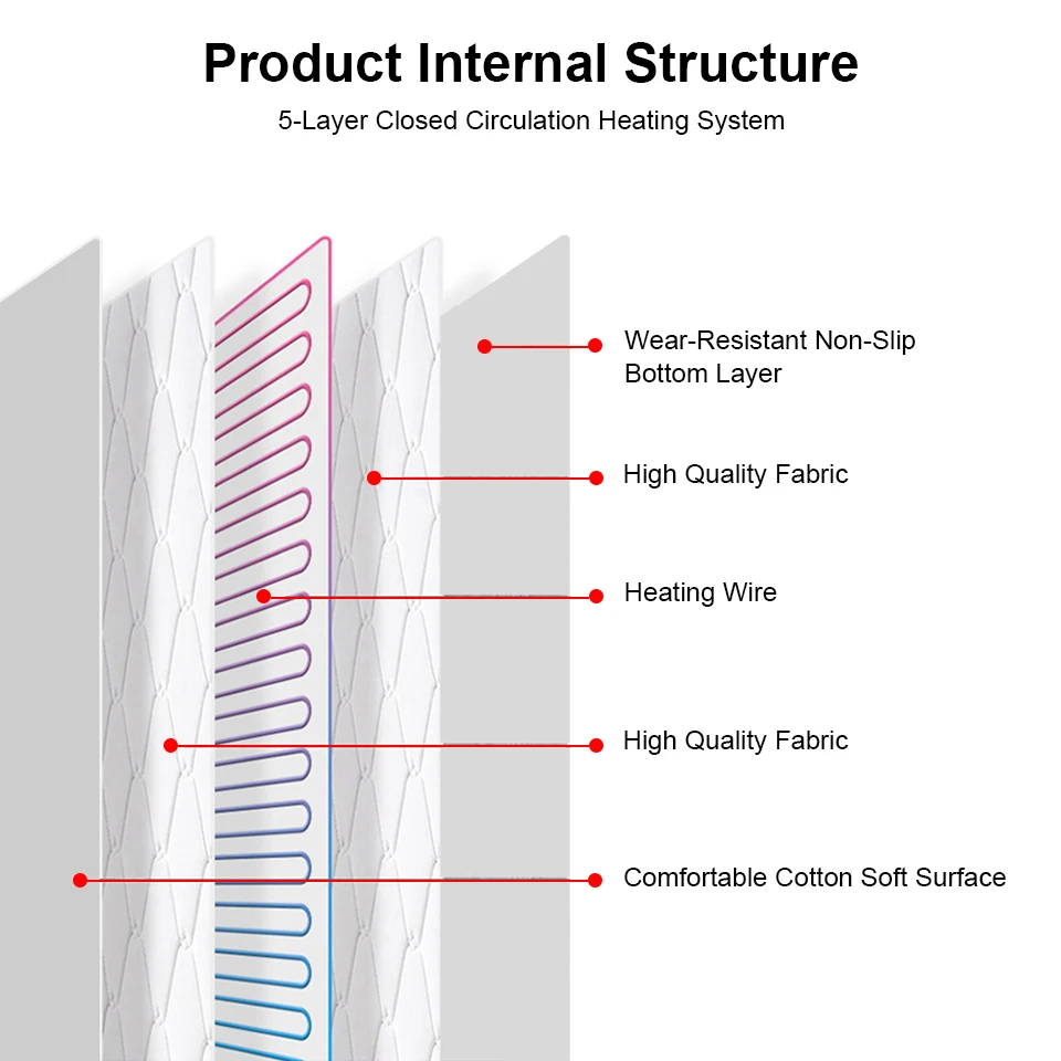 1. Синтетическое волокно (85%) + плюш (15%).2. Жесткий хлопок.3. Спиральный нагревательный слой.4. Жесткий хлопок.5. Низ из волокна
