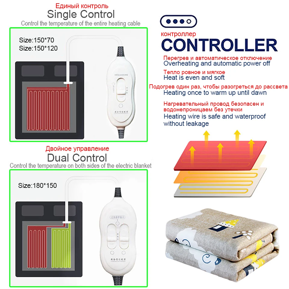 1. Двойной регулятор (150*180 см), есть 3 шестерни, высокая температура, низкая температура и переключатель, может контролировать температуру левой и правой сторон отдельно.2. Одиночный Контролер (70*150/120*150 см), есть 3 шестерни, высокая температура, низкая температура и переключатель, только может контролировать общую температуру.3. Защита от перегрева: во время использования продукта, пожалуйста, предварительно нагревайте продукт в течение 15-30 минут, пожалуйста, настройте на низкую температуру перед глубоким сном. Рекомендация: для безопасности детей, пожалуйста, не используйте его отдельно.