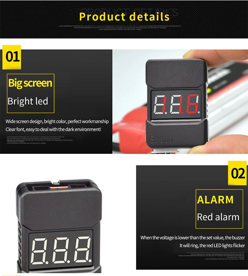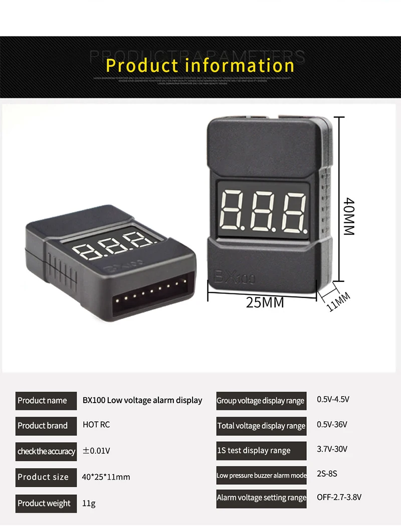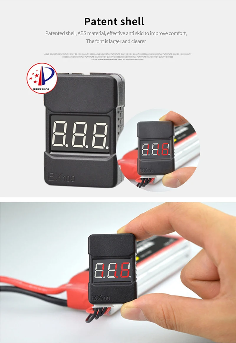 Особенности:Корпус из АБС-пластика, эффективное противоскользящее покрытие и улучшенный комфорт.Большой и четкий шрифт, громкий звук.Точный дисплей и простота подключения.Компактный дизайн и легко носить с собой.Описание:10 шт./лот Hotrc BX100 1-8S индикатор RC Li-Ion Lipo батарея тестер низкого напряжения зуммер сигнализация RC инструменты.