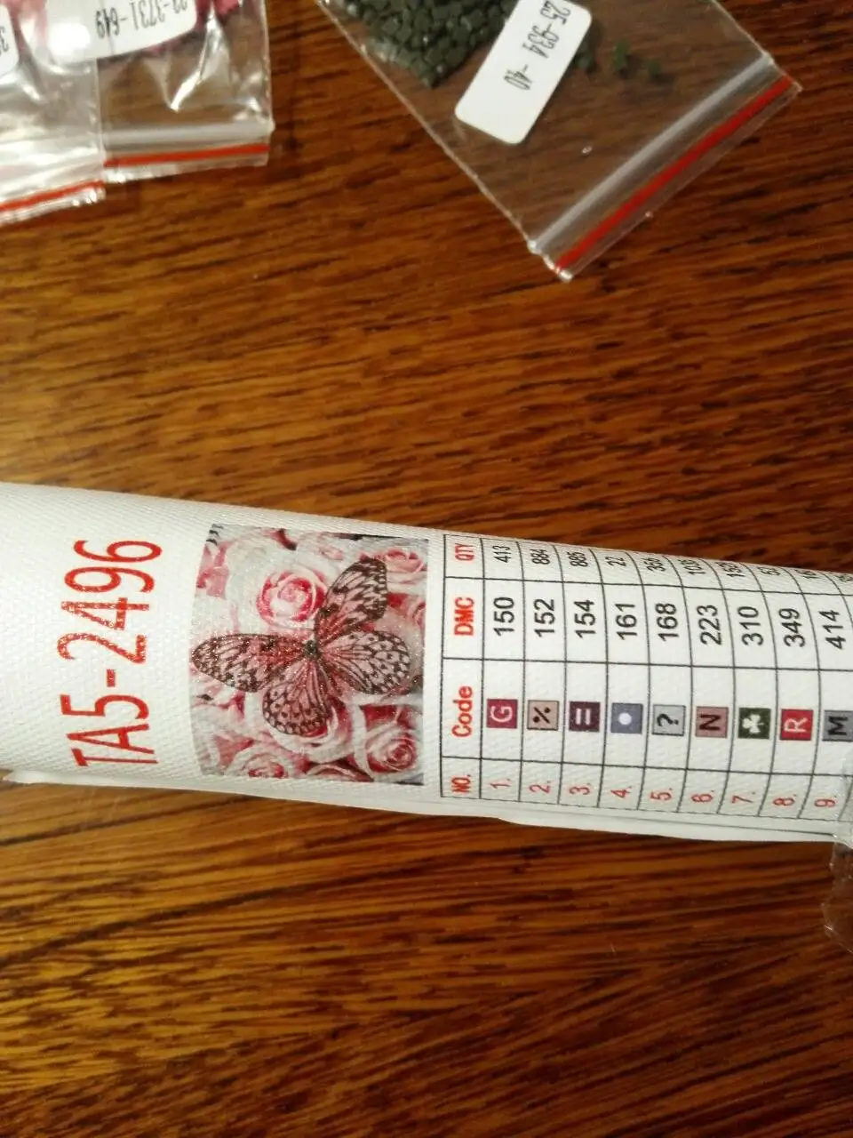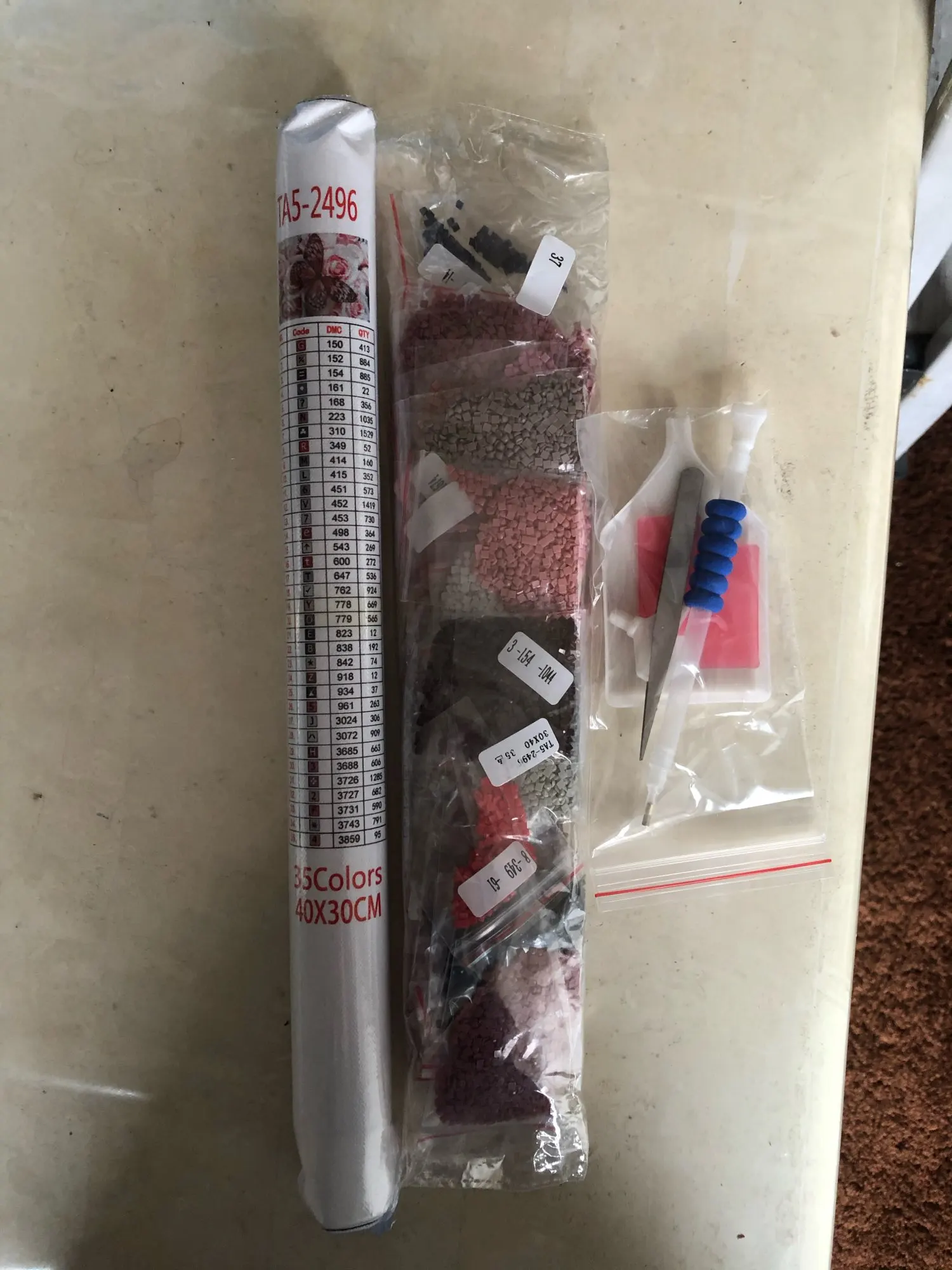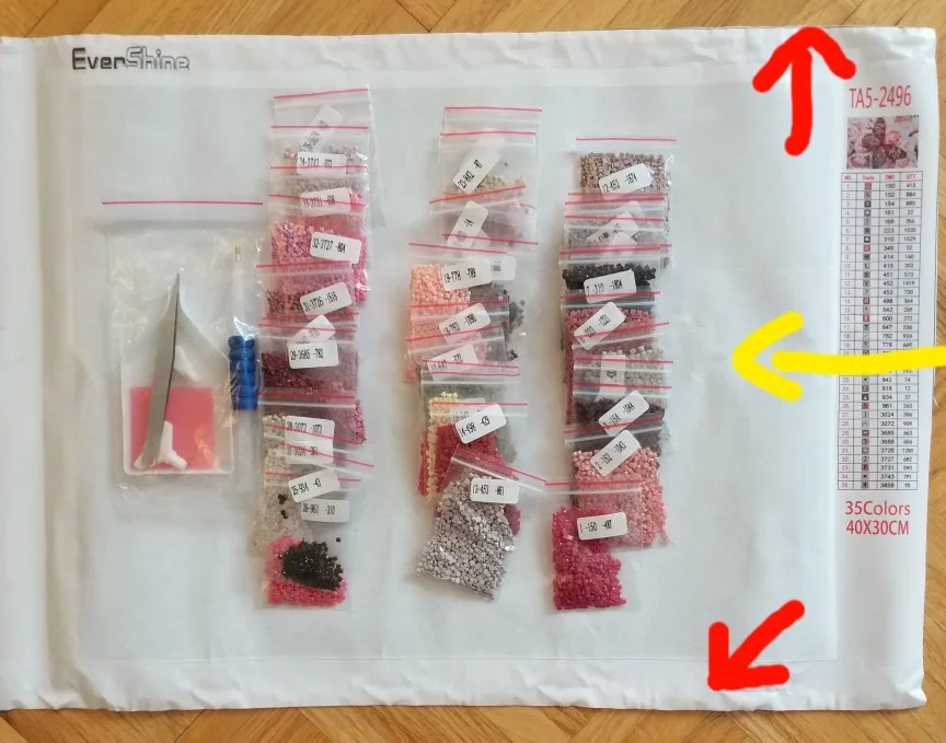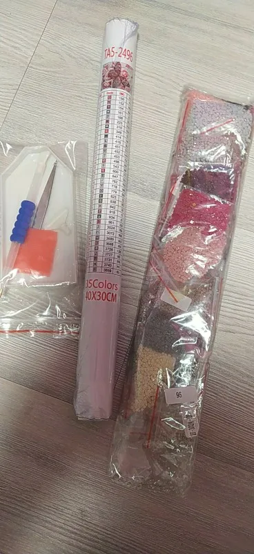 Заказ пришел быстро, в пупырчатом конверте. Полотно намотано на валик, в идеальном состоянии. Отличный набор инструментов , стразы расфасованы по зип-пакетам, 35 цветов. Белого цвета нету совсем, цвета розово-красные и серо-коричневые. Картина будет не яркая. Заказом довольна.