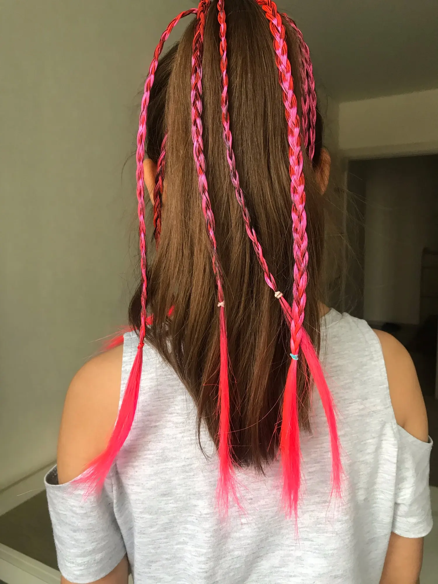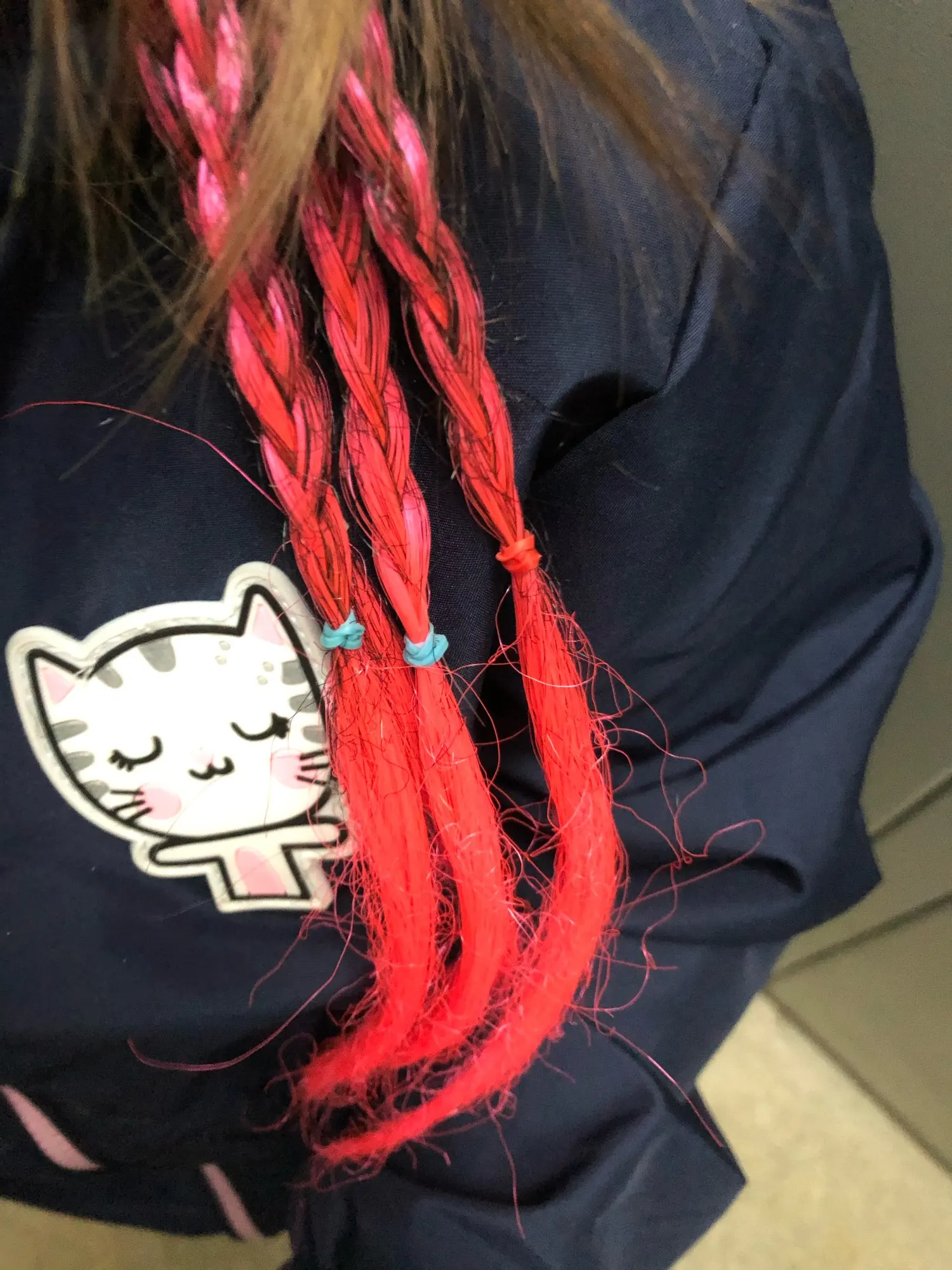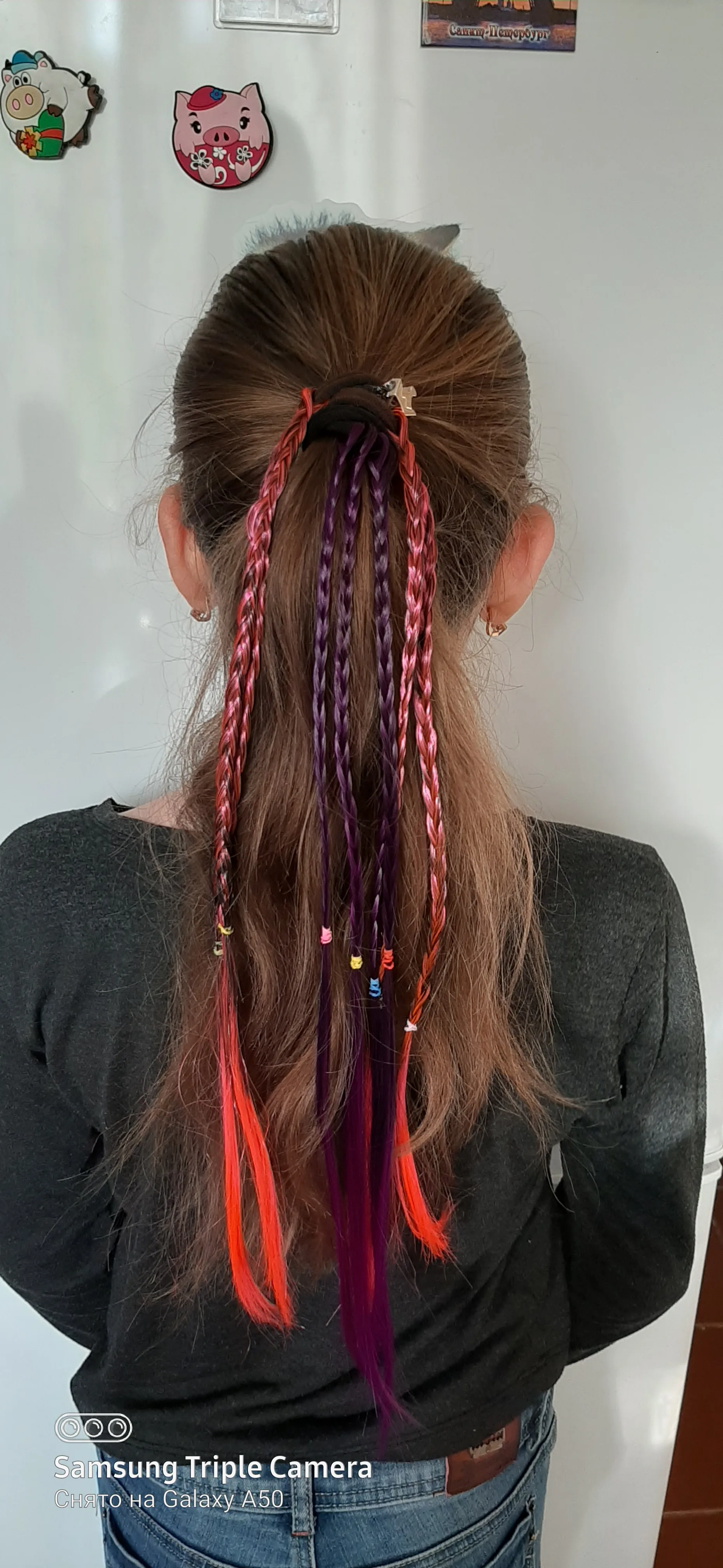 Немного не опрятно выполнены косички. Также не понравилось то, что резиночки ярких разных цветов на самих косичках, но это уже не критично и на свой вкус.