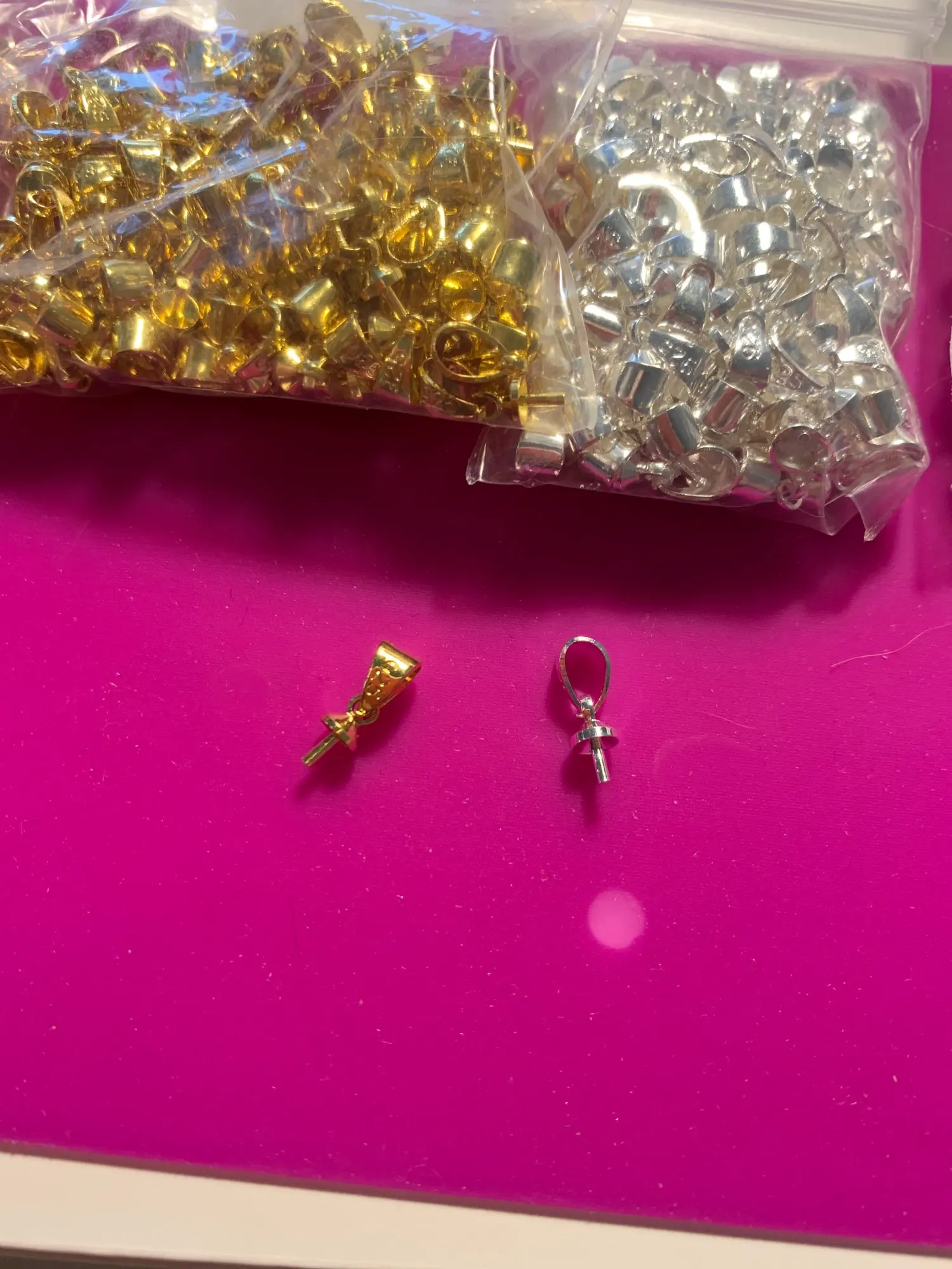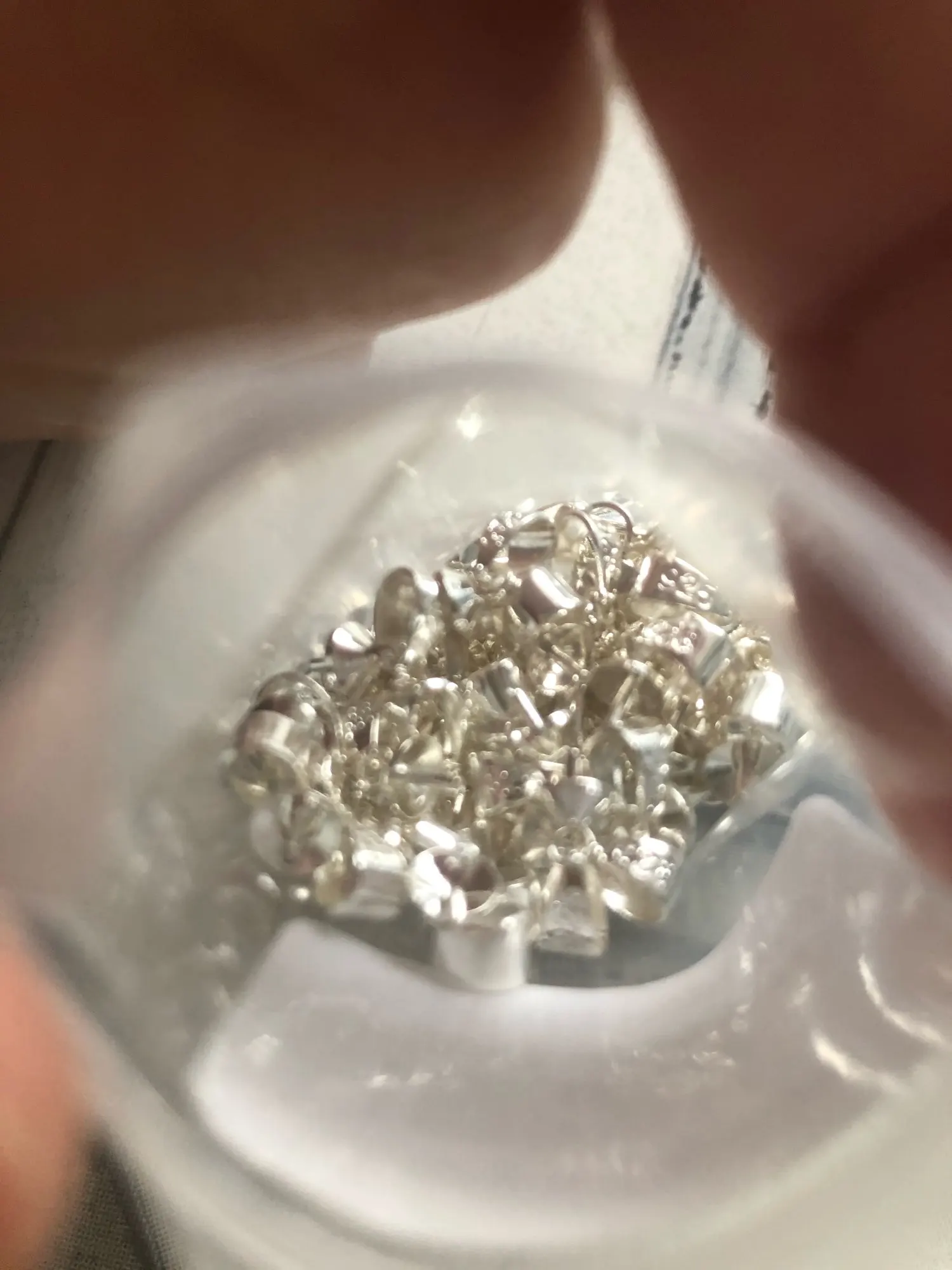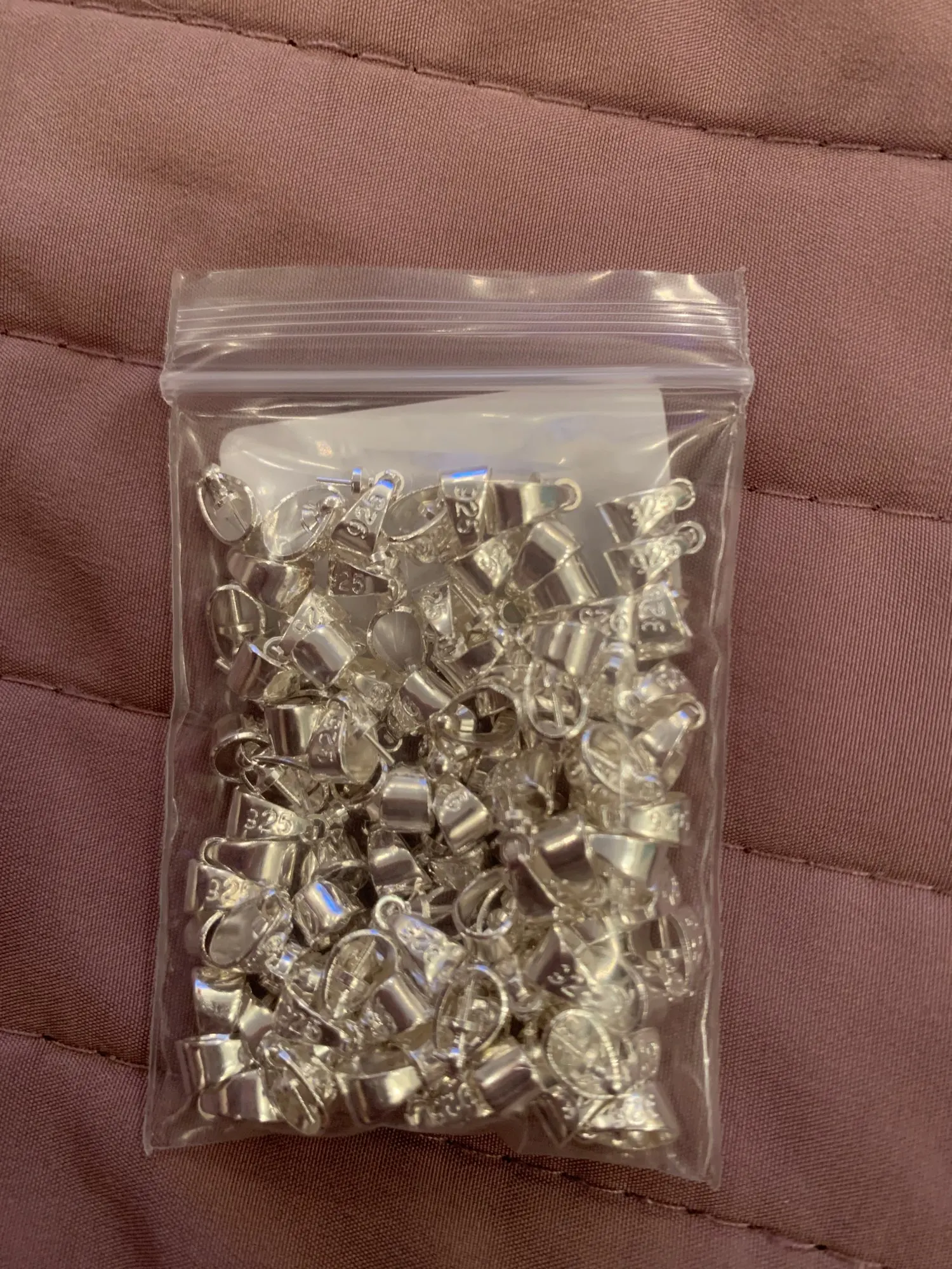 Выглядит как на фото , не знаю серебро или нет но 925 цифро написана. Лично мне кажется что дополнительно родировано. Надеюсь что сам бейл спаян, при нажатии не двигается. Но для тяжелых кулонов лучше не использовать, так как самая нижняя бейла которая соединяется с шапочкой где то 0,8 мм. По количеству 101 шт. Доставка примерно 1,5 мес