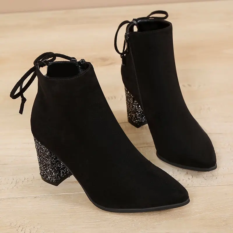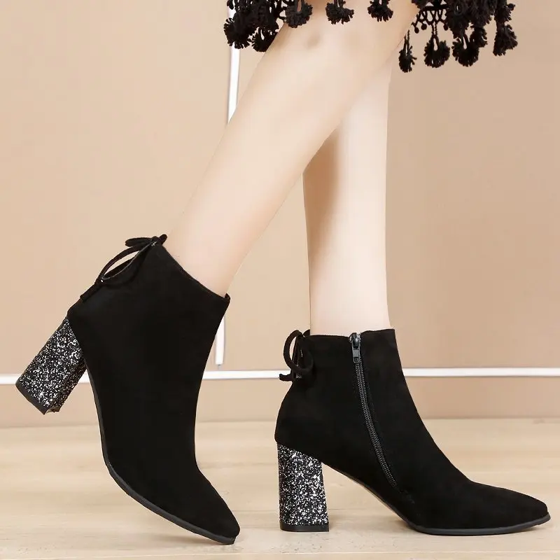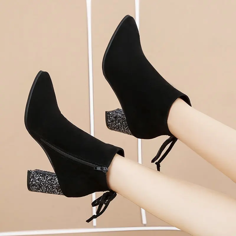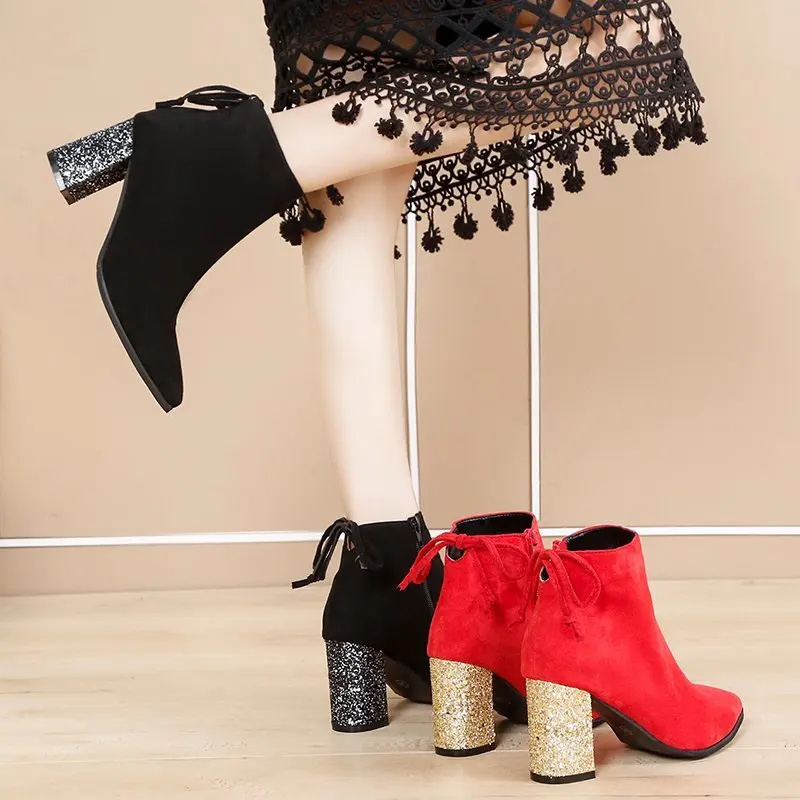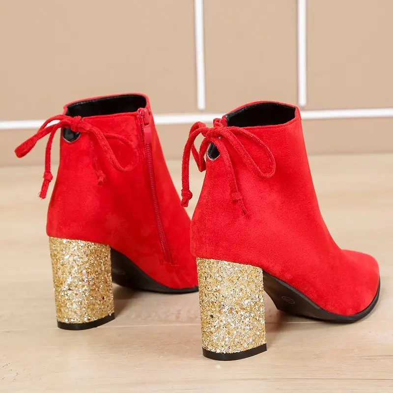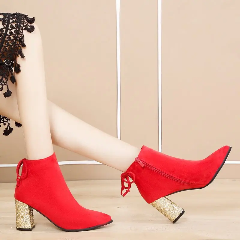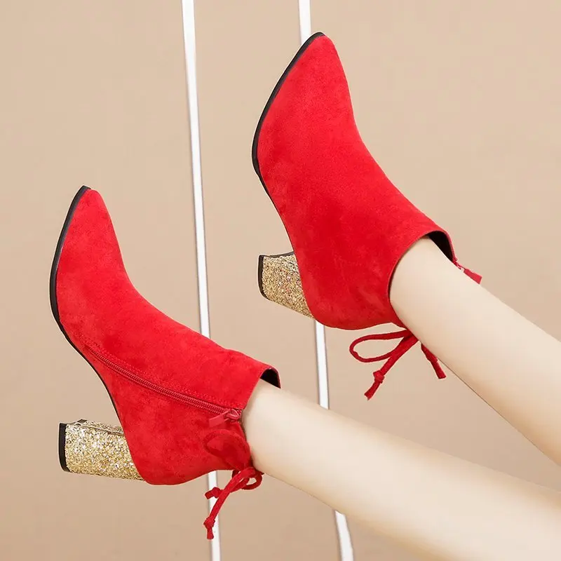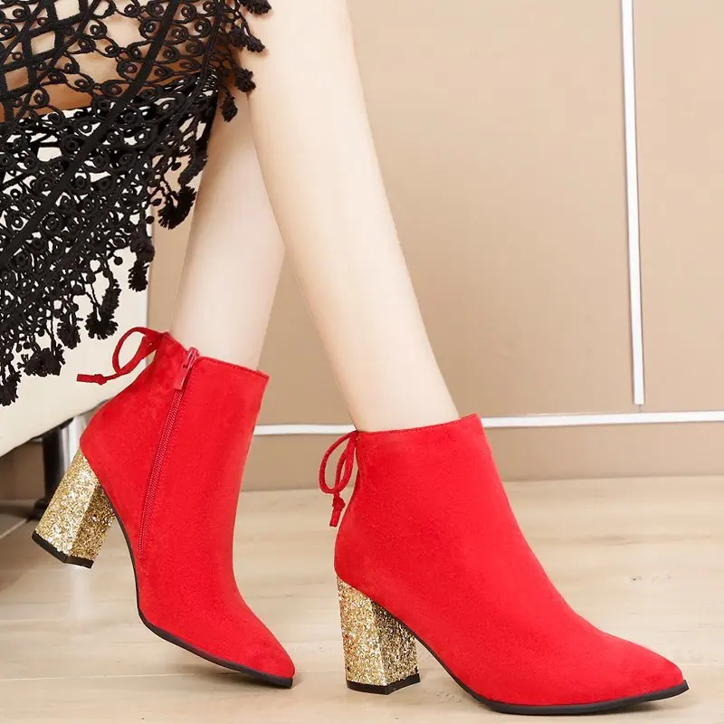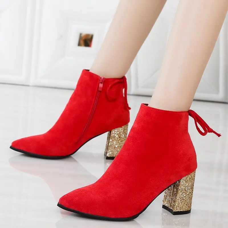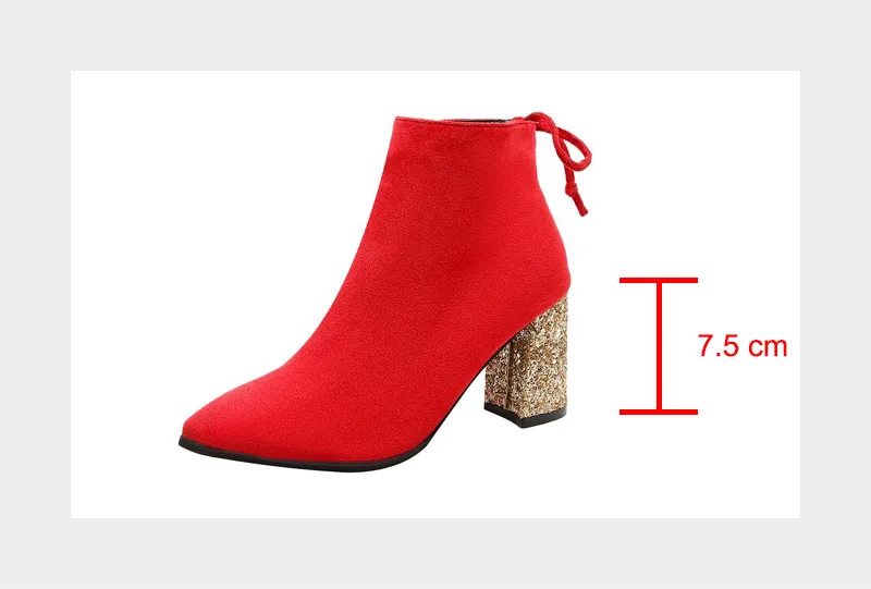 Ботильоны на высоком каблуке, классические туфли с острым носком, женские ботинки на золотом каблуке, зимние женские черные ботинки из флока, красные 8450N, 2020