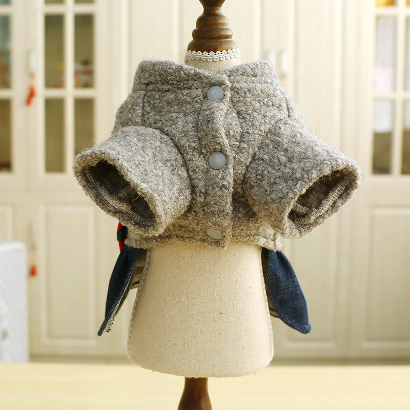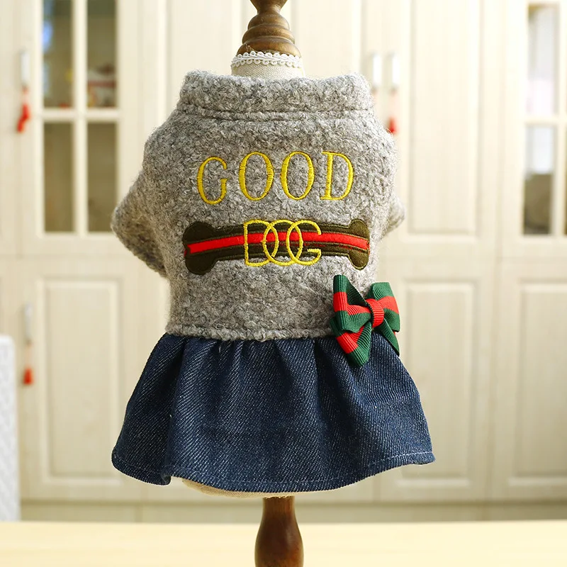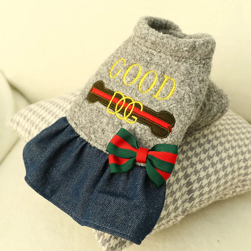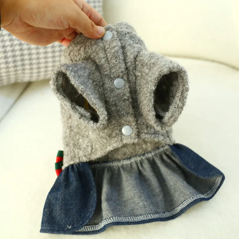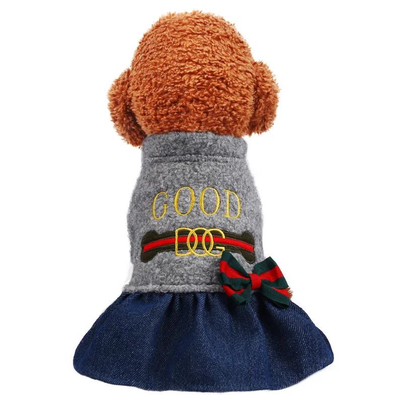 Джинсовая юбка для щенков, осенне-зимняя теплая шерстяная юбка с галстуком-бабочкой для померанского шпица, чихуахуа, куртка для маленьких собак