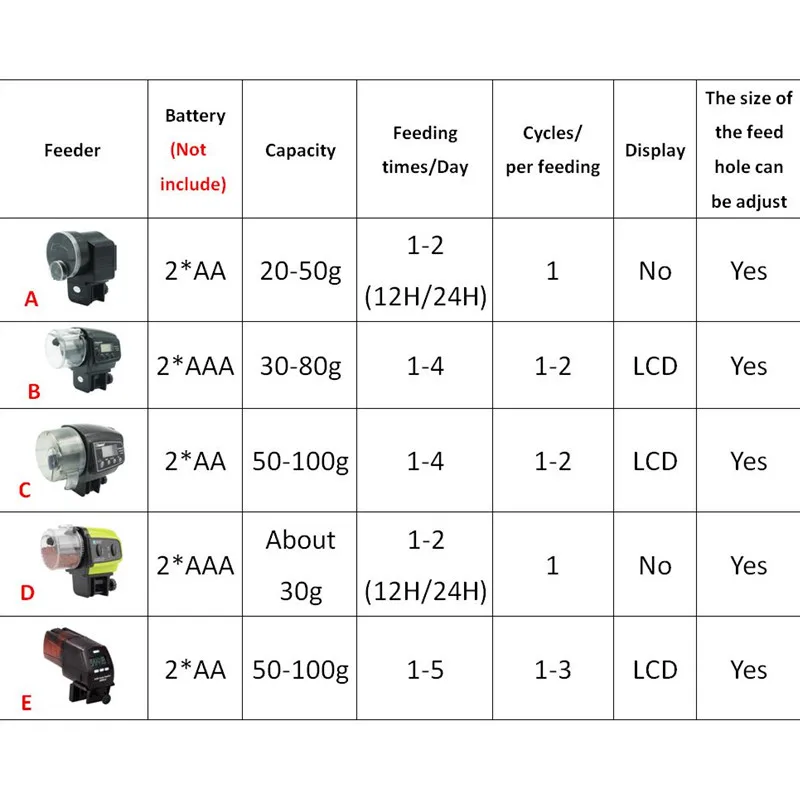 Время кормления: 2 раза в день(Фидер A & D), 4 раза в день(Фидер B & C), 5 раз/день(Фидер е)