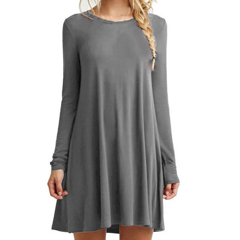 Женское однотонное платье с длинными рукавами, повседневное свободное однотонное платье из полиэстера с круглым вырезом, Осень-зима