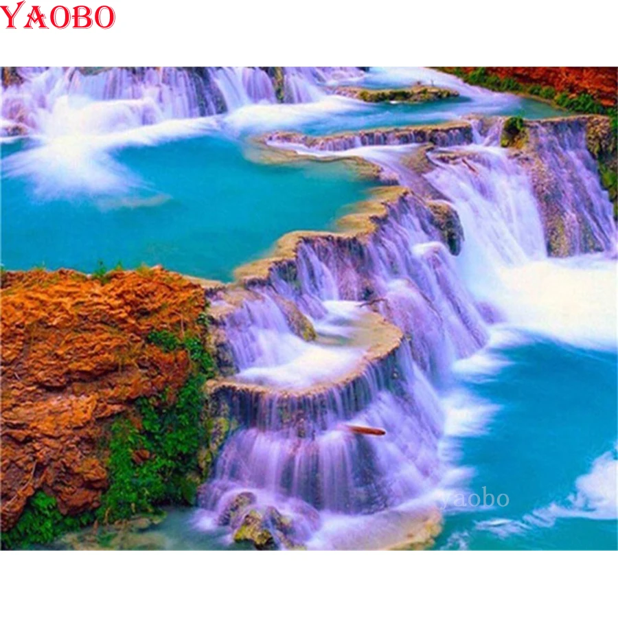 Алмазная 5d-картина с полным кругом, пейзаж, водопад, озеро, лес, украшение, мозаика из страз, вышивка крестиком