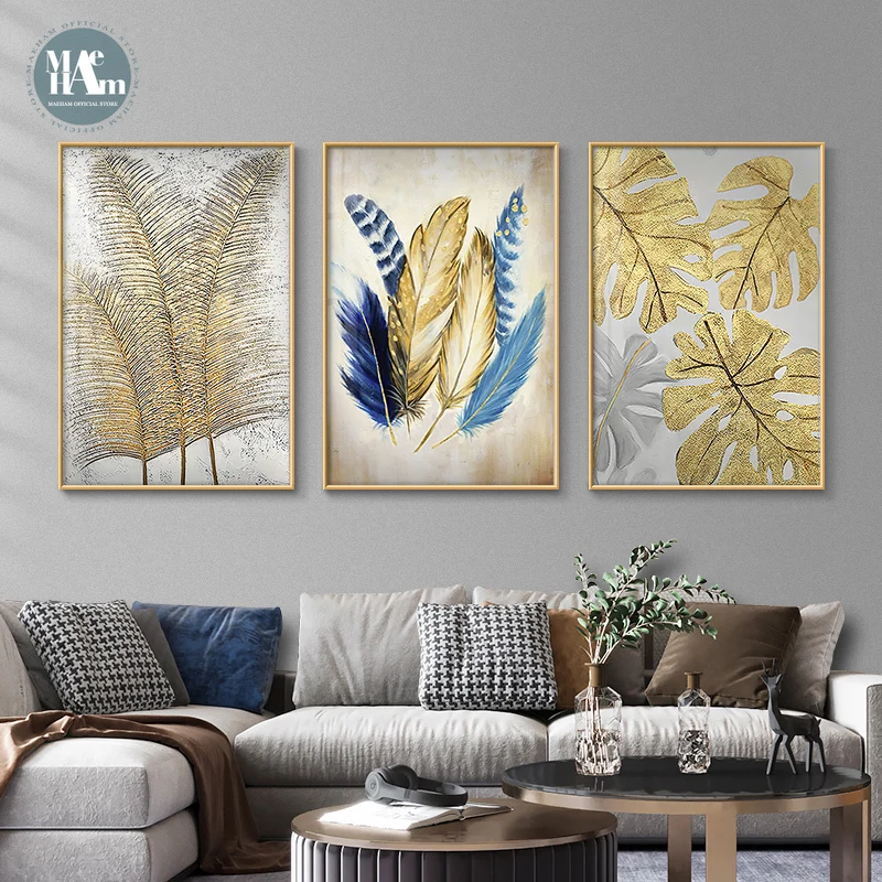 Настенная живопись с золотыми листьями, Картина на холсте для гостиной, Скандинавская абстрактная декоративная картина, Современное украшение