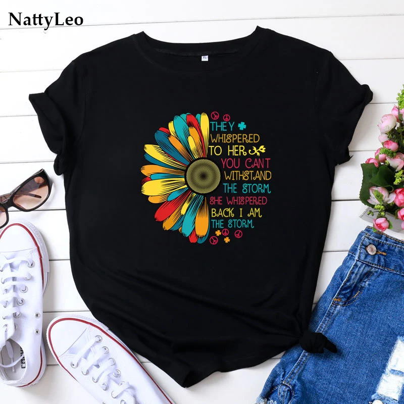 Женские рубашки, 100% хлопок, футболка с принтом букв и подсолнухов, женские футболки с круглым вырезом и коротким рукавом, летняя женская футболка, топ