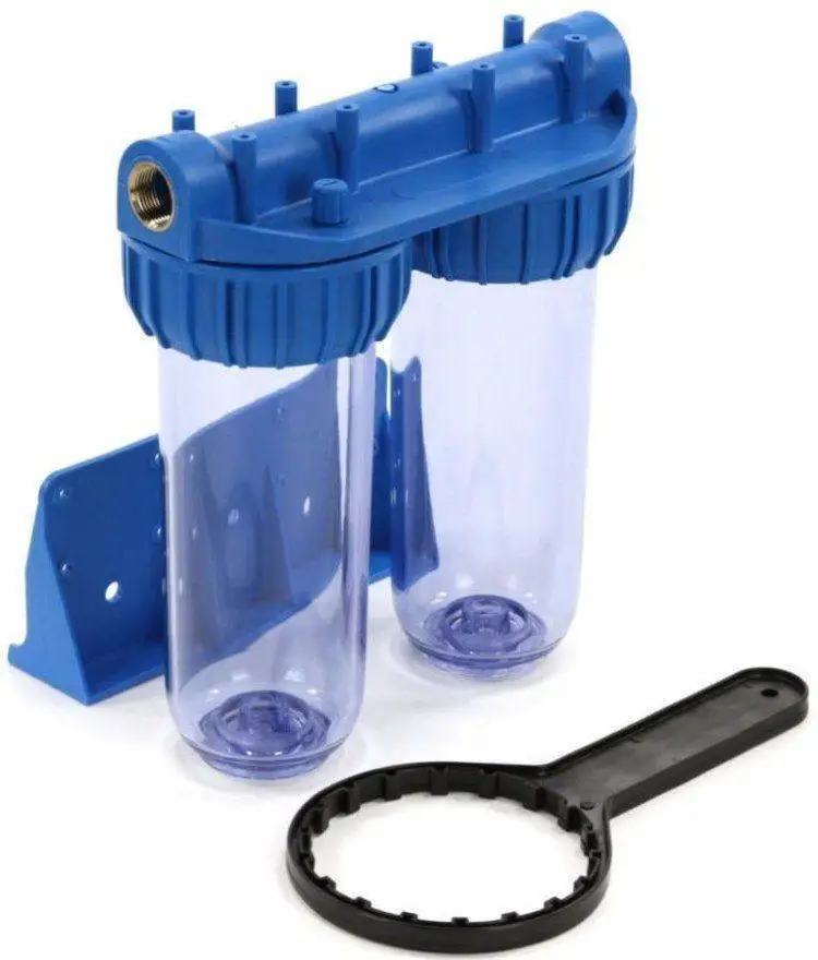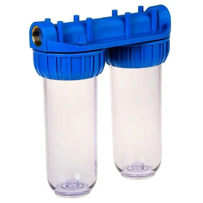 Наиболее компактная версия магистральных фильтров для холодной воды. Имеет две прозрачные колбы, установленные на общей платформе. Монтируется на входе в дом (из колодца, скважины или стояка). В зависимости от установленного картриджа, способен очищать воду от твёрдых примесей (песок, ржавчина и т.п.), тяжёлых металлов, органических примесей и т.п. К данному фильтру подходят почти все виды картриджей серии Slim 10. Поставляется в комплекте с полипропиленовым картриджем для механической очистки (улавливает частицы до 10 микрон) и угольным картриджем для органических примесей. По запросу, можно укомплектовать фильтр картриджами по желанию, но картриджи, идущие в комплекте, отлично подойдут для большинства случаев.Преимущества данной модели в сравнении с одинарной версией:лучшая степень очистки (2 фильтра вместо одного)простота установки (по сравнению с вариантом, когда ставится несколько одинарных колб)угольный картридж в комплектеК минусам можно отнести тот факт, что в комплекте идёт только один ключ и в случае лопнувшей из-за мороза колбы скорее всего придётся менять весь комплект целиком.