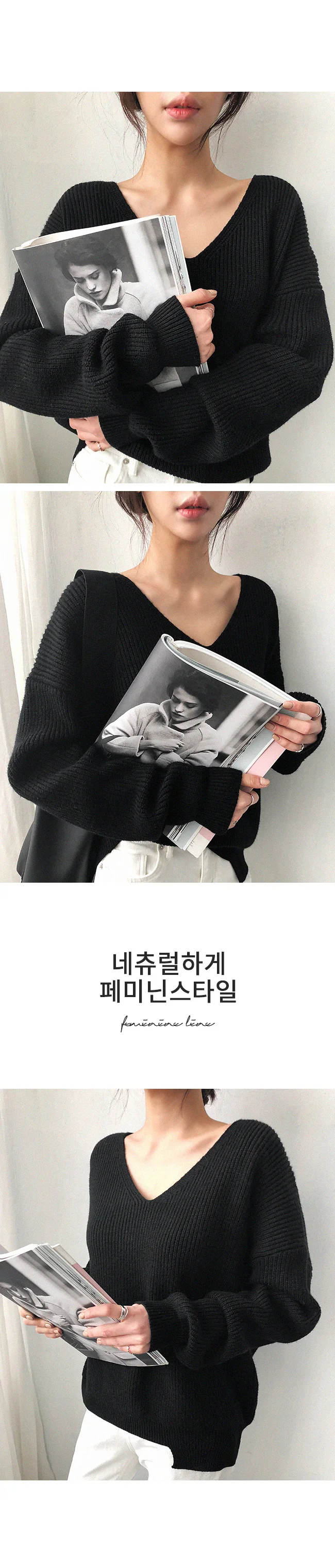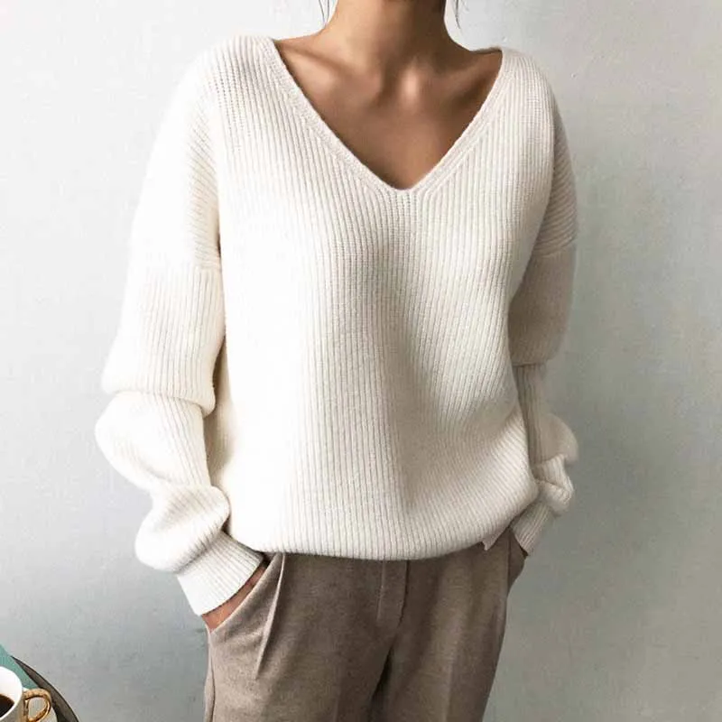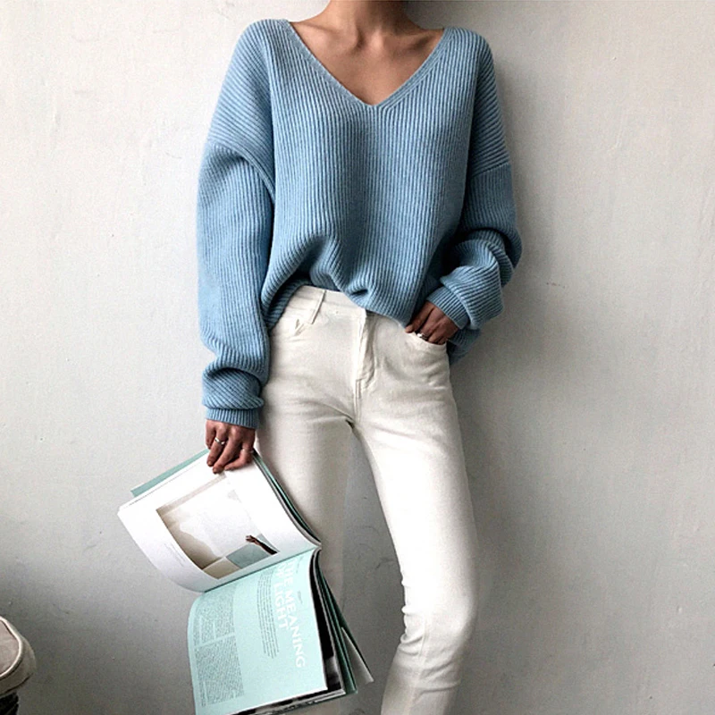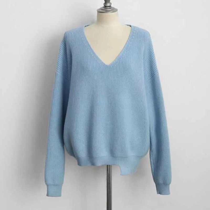 Женский трикотажный свитер, свободный однотонный пуловер с V-образным вырезом, в Корейском стиле, зима 2020, размера плюс