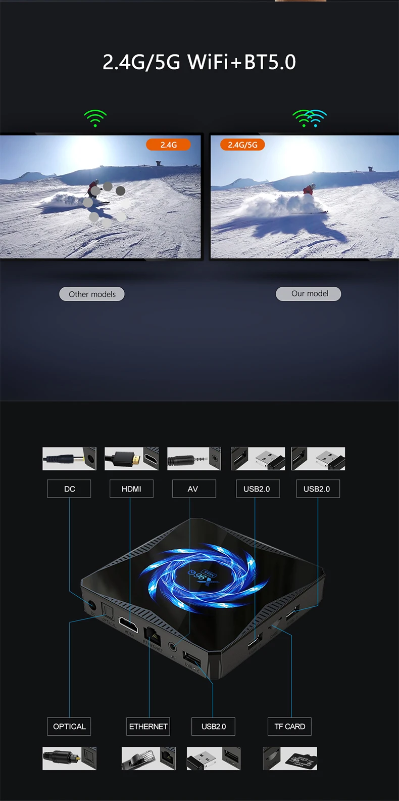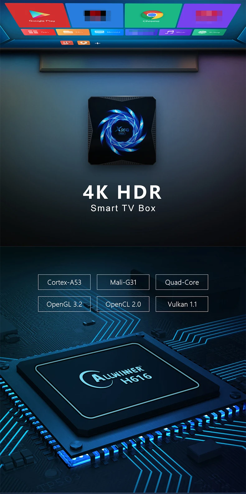 Характеристика:Процессор: Allwiwer H616 четырехъядерный 64 бит Cortex-A53Графический процессор: Mali-G31 MP2O.S: Android 10,0Память: RAM 4G ROM 32G/64GБеспроводной: WiFi 2,4G 5GUSB: USB 2,0*2LAN: Стандартный 10/100 м RJ-45HDMI: HDMI 2.0a для 6K @ 30fps3D: жесткое 3D Графическое ускорениеEthernet: стандарт 10/100 RJ-45Мышь/Клавиатура: Поддержка Мышь и клавиатуры через USB; Поддержка 2,4 ГГц беспроводной Мышь и клавиатура через 2,4 ГГц USB донглЯзык: английский, русский, французский, немецкий, испанский, итальянский и т. Д.