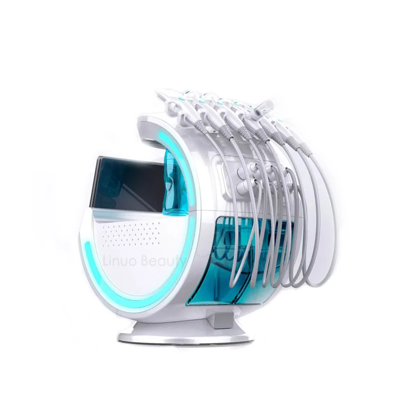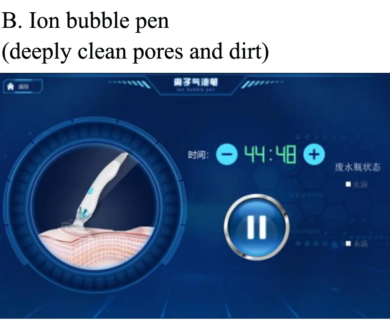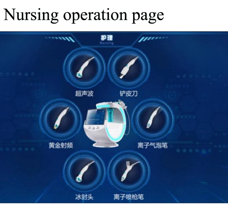 1) multi-function integration: this product sets skin detection, custom beauty program, product push; basic beauty care, cuticle cuticle cleaning, deep cleaning, deep hydration and nourishing, anti-aging maintenance, sedation and repair functions in one one machine multi-energy, market demand is large. High 2) comfort: the handle appearance design conforms to the human body engineering mechanics principle, the material skin friendly feeling is strong, the body feeling is comfortable. 3) function principle: the core principle of this product is 3 spectrum sampling, AI intelligent skin measurement, push of intelligent products, customization of AI beauty scheme; six nursing functions :" ultrasonic shovel knife "," atmospheric bubble "," nano atomization "," ultrasonic "," gold radio frequency "," ice repair ". Simple 4) operation: AI intelligent analysis, convenient operation, easy to use, no surgery, no broken skin, strong safety.