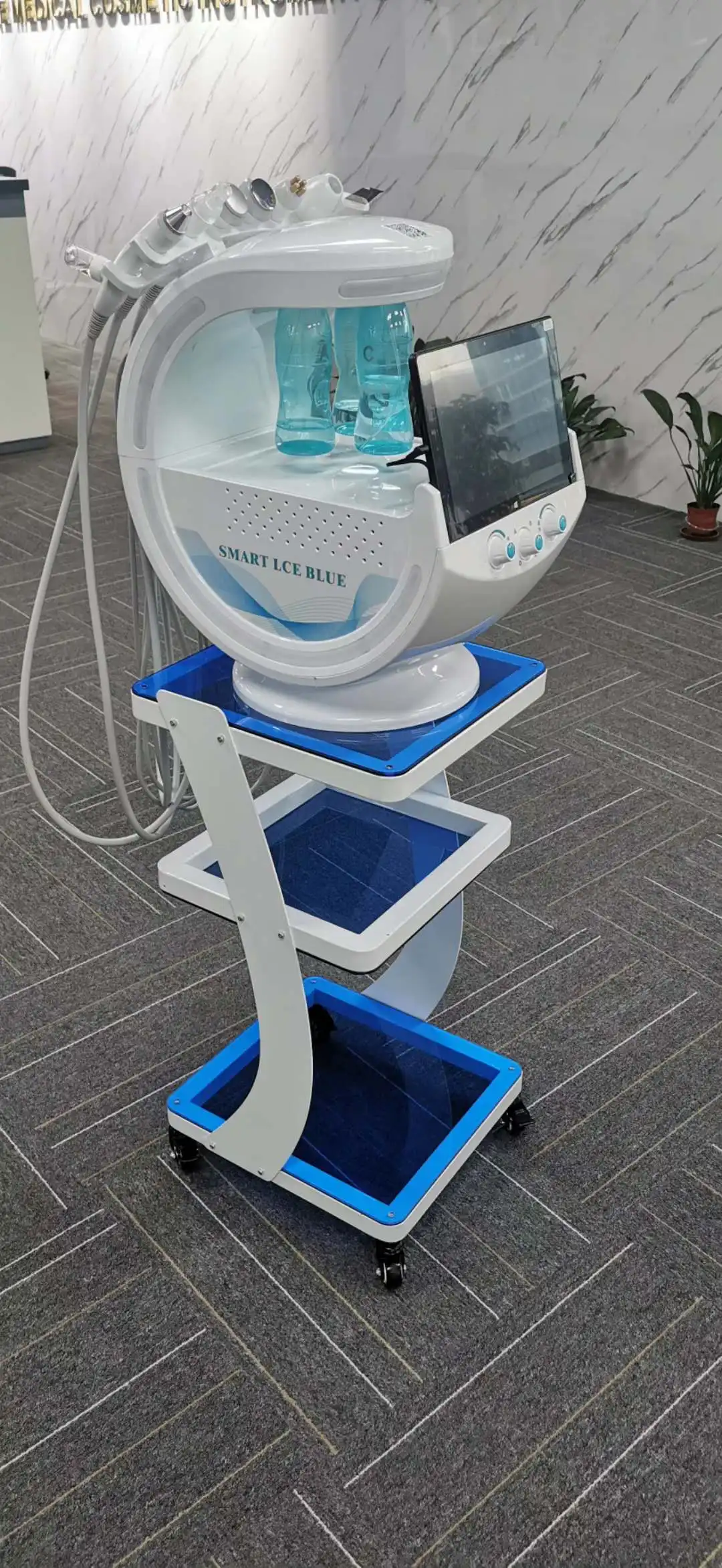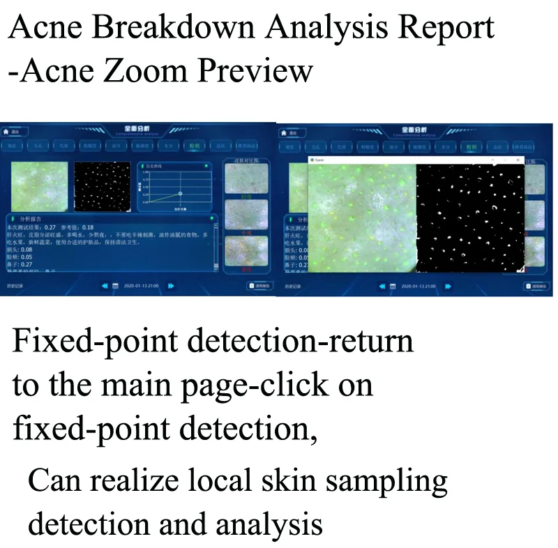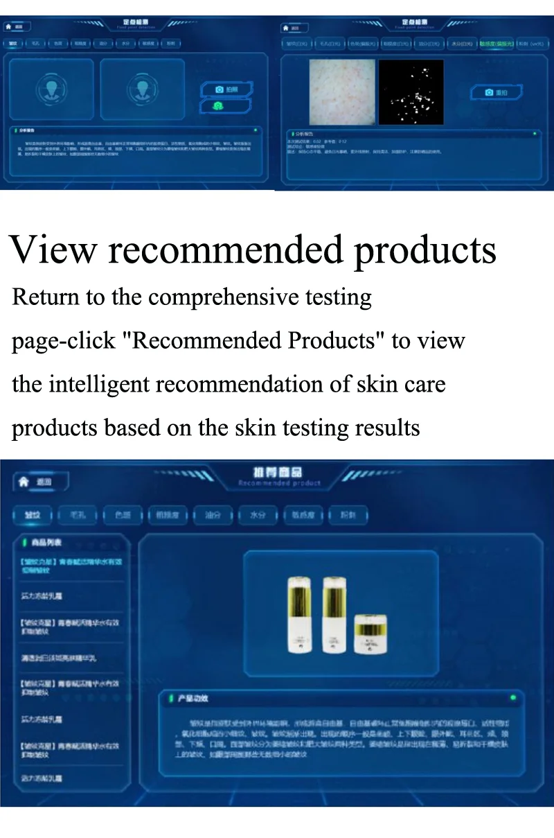 The intelligent ice blue skin management system (hereinafter referred to as "this product ") is to collect facial skin detail images through 10 million pixel high-definition micro-range camera combined with three-spectral imaging technology, through intelligent diagnosis and analysis of artificial intelligence core engine ,8 dimension fine items to detect skin problems, and according to the diagnosis results of private customized beauty care program and intelligent recommendation of professional skin care products; Combined with the techniques of" ultrasonic shovel knife "," bubble "," nano atomization "," ultrasonic wave "," gold radio frequency "," ice repair "and so on, the six high configuration beauty functions comprehensively manage the skin, combine the results of AI skin diagnosis with skin care products and other skin care items, and develop a multi-functional integrated equipment for skin detection and management.