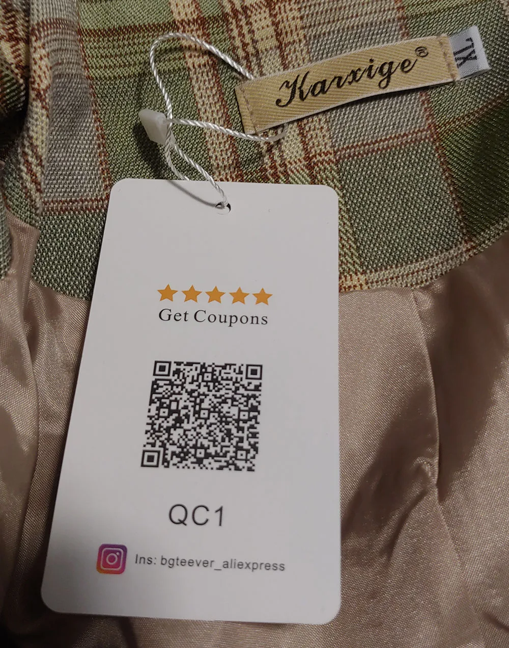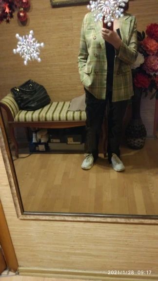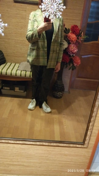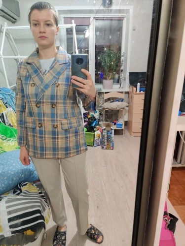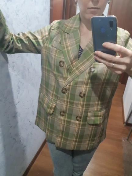 Пиджак отличный! Ещё и за небольшую цену! Долго не решалась заказать, боялась не угадать с размером, но в итоге заказала и не пожалела! Размер L заказала, ориентируясь на отзывы, в плечах сел как надо, рукава не короткие! Мой русский размер одежды 46. Клетка на спине сходится, а вот по бокам нет. Пиджак отлично отпарился утюгом. Качество пошива хорошее. А вот структура ткани мне не очень нравится, возможны зацепки. Но все равно это лучший пиджак из просмотренных мной! Для меня было проблемой найти что то похожее у нас в магазинах, заказывала на WB 5 разных вариантов, и в понравившихся моделях были вытачки не на том месте. А в этом пиджаке, о чудо! - вытачек нет! Для маленькой груди это плюс! Доставка 13 дней в Россию.