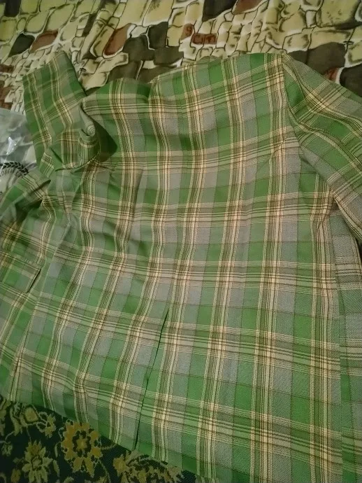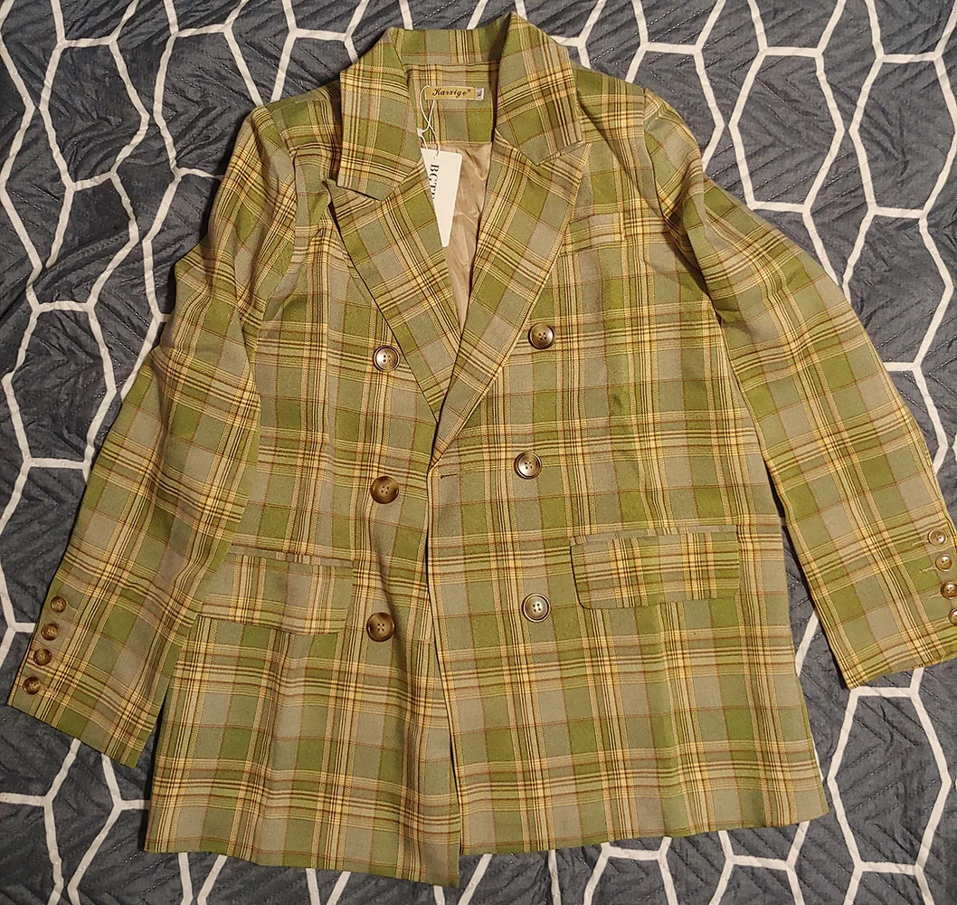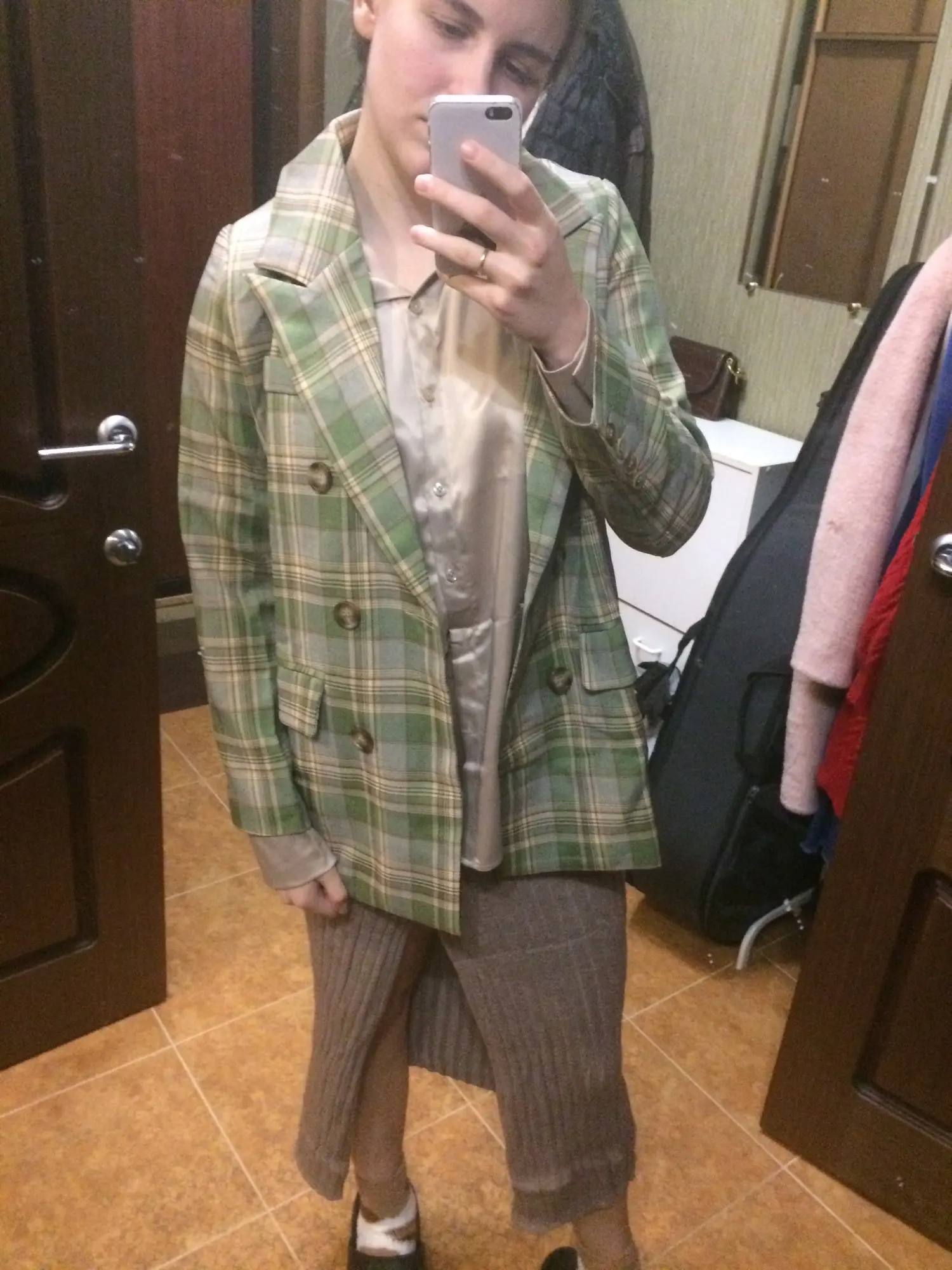 Пиджак пришёл быстро за 3 недели, доставка полностью отслеживалась, на мой российский 48 размер сидит хорошо, но не оверсайз, качество хорошее для данной цены, посторонний запах отсутствует, швы ровные, нитки нигде не торчат, пошив аккуратный, клетка не везде совпадает, но для меня это не критично, зелёный цвет более яркий, чем на фото, продавец положил в подарочек резинку для волос, отдала ребёнку, она довольна, спасибо продавцу.