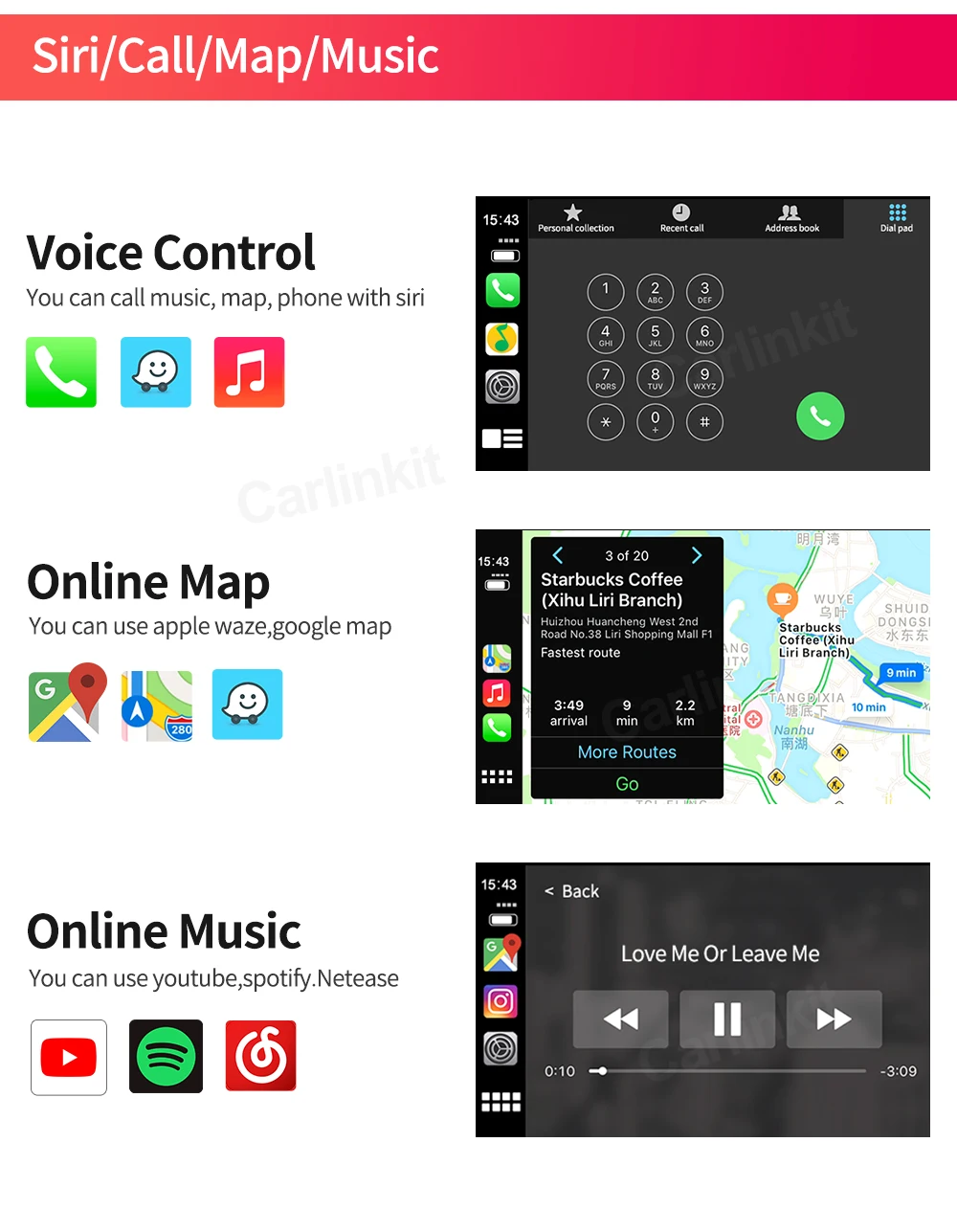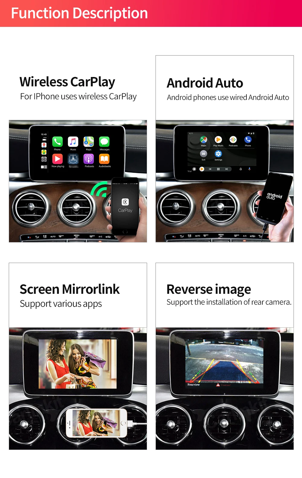 1. Работает с Apple CarPlay, через USB подключение2. Работает с проводным CarPlay также, сначала выключите Wi-Fi, подключите через кабель освещения (проводное Удерживайте телефон одновременно)3.Android Mirroring-Link для телефонов Android (ссылка для скачивания)4.GPS навигационные приложения, Google Maps, Waze и Apple Maps доступны в режиме реального времени5. Музыка яблоки Spotify, Apple Music, Amazon и т. д. аудио через фабрику Audi media, текст на дисплее для некоторых приложений.6. Голосовое управление, говоря: "Эй, Сири...7.Aftermarket фронтальный/задний/360 вход камеры. (Поддерживаются динамические Направляющие линии)8.USB флэш-накопитель для воспроизведения музыки и видео с помощью подключения USB порта от CarPlay kit9. Регулировка эквалайзера. Лучшее качество звука. Выберите свой любимый стиль свободно (поп, рок, мягкий, стандартный ..)10. Полное управление кнопками OEM.