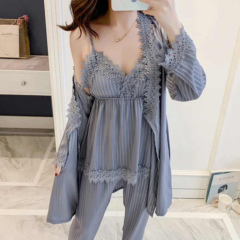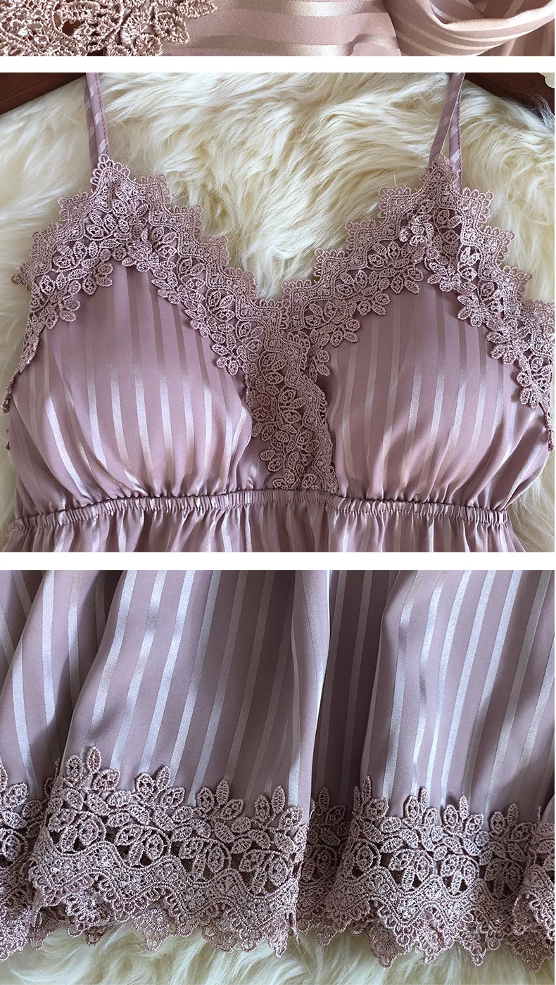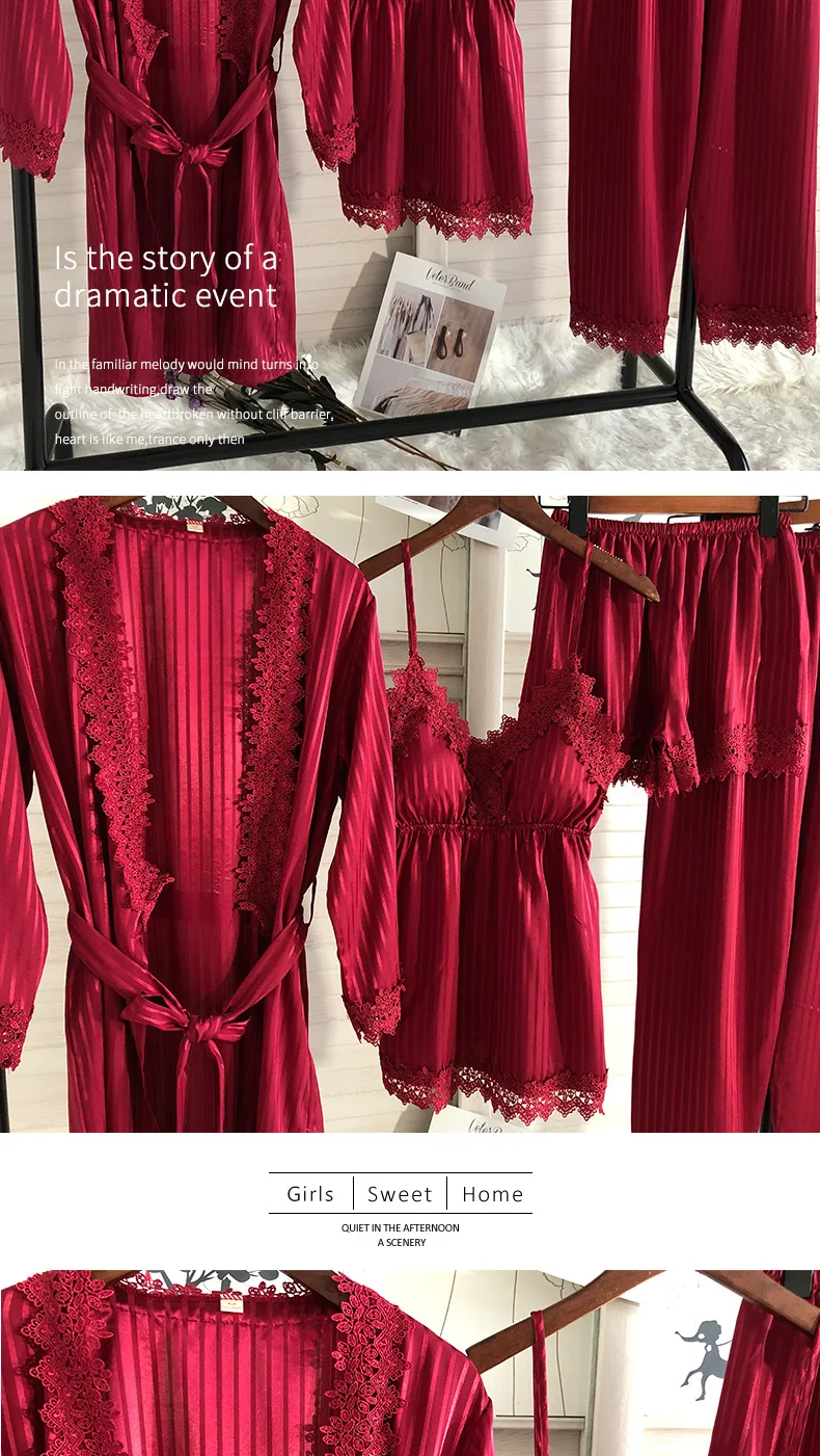 Сексуальный женский кружевной пижамный комплект из 4 предметов, ночная одежда в полоску, топ на бретелях с открытой спиной и штаны, атласная пижама с поясом, весенне-осеннее Ночное платье