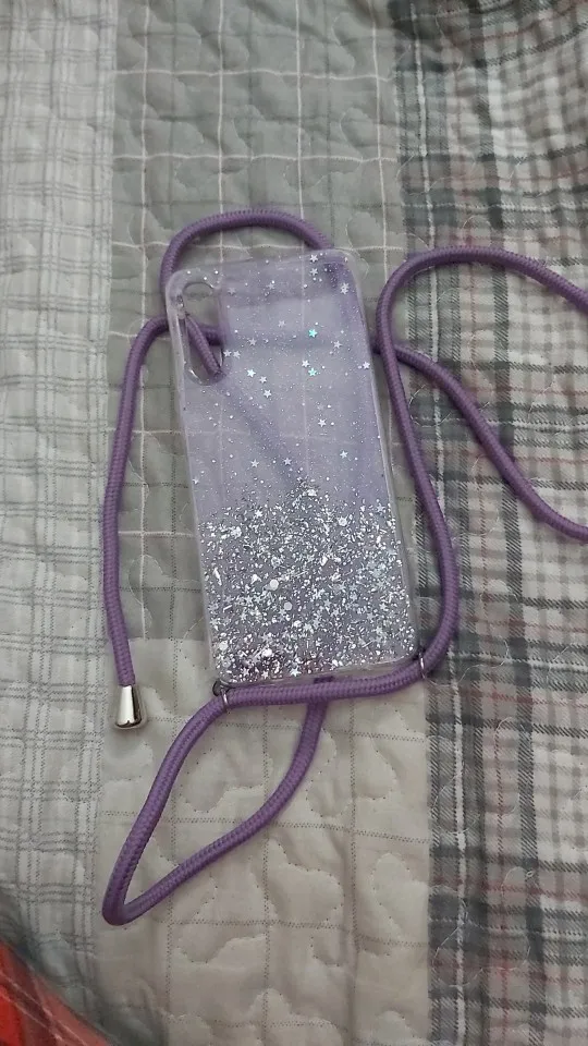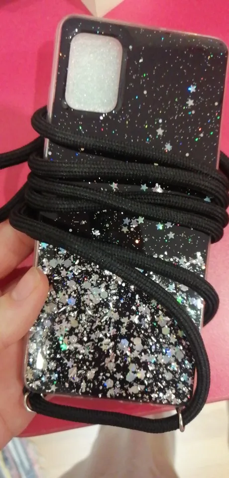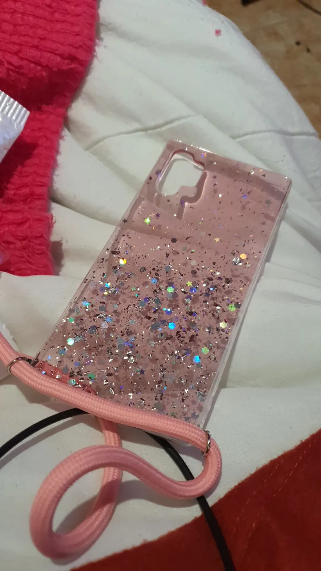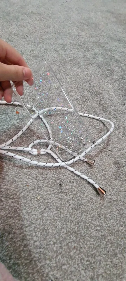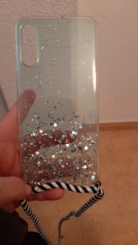 Es de plástico rígido, con lo cual creo que va a protejer bastante bien el móvil. La purpurina se ve muy bonita y el cordón es bastante grueso, suave y se puede regular en altura. Estoy muy contenta con el producto.
