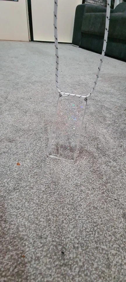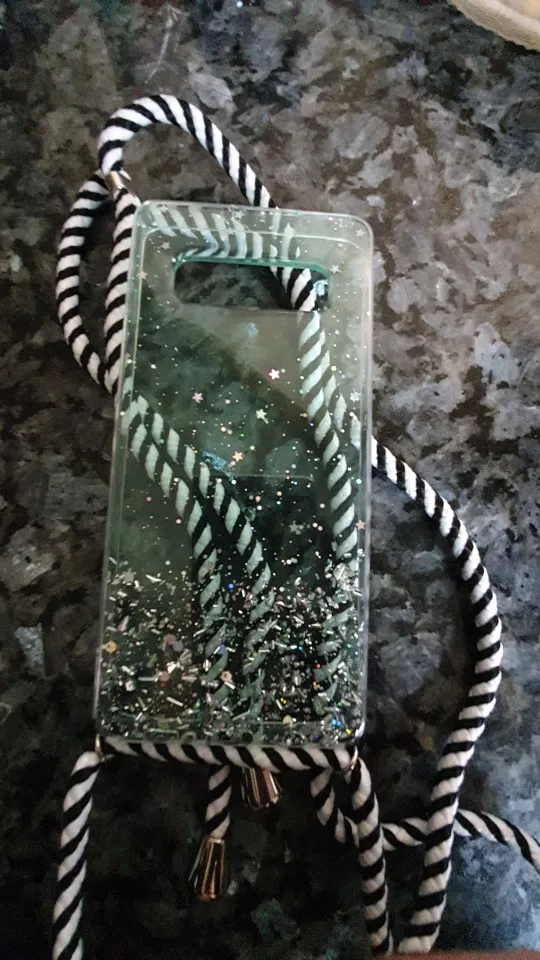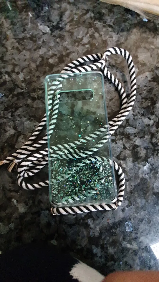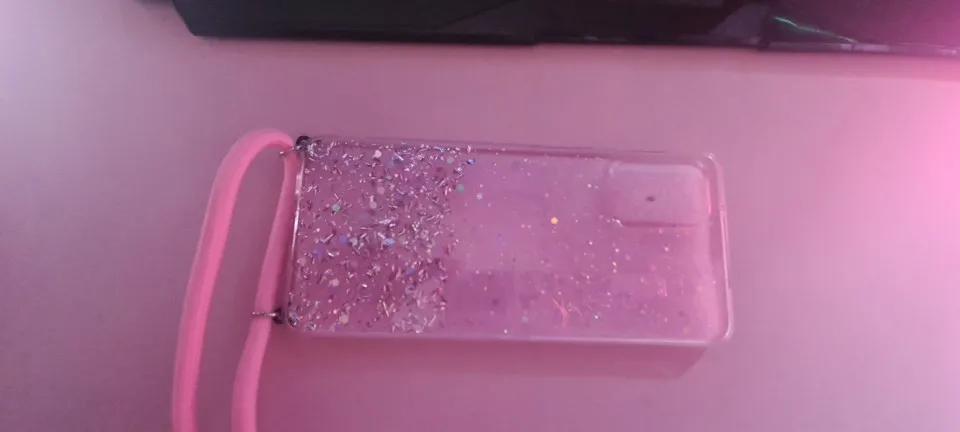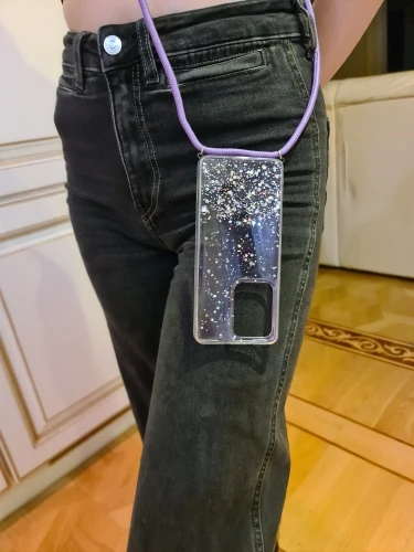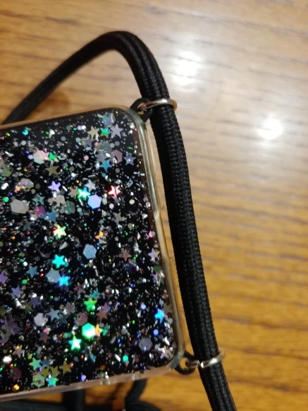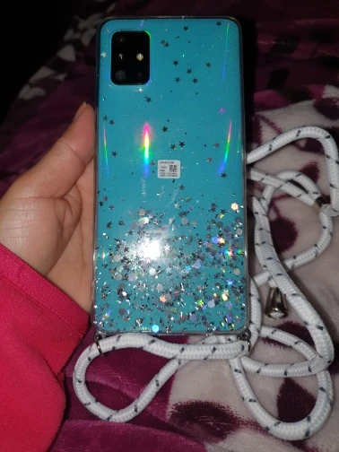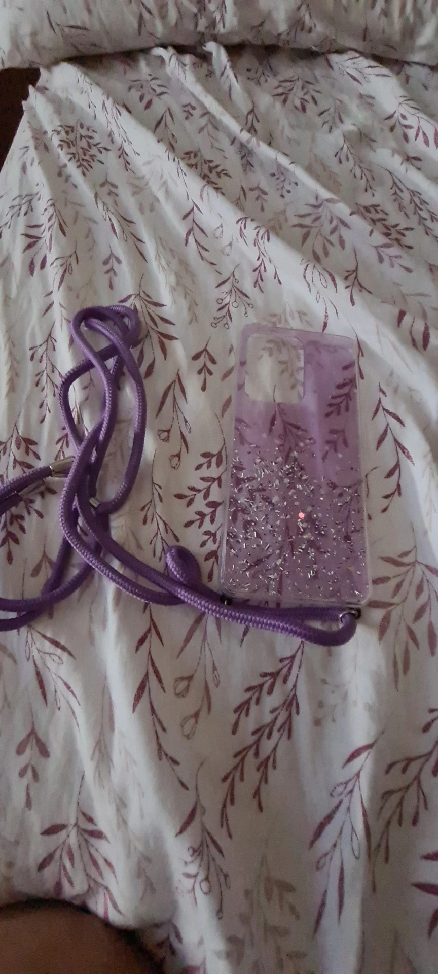 Es de plástico rígido, con lo cual creo que va a protejer bastante bien el móvil. La purpurina se ve muy bonita y el cordón es bastante grueso, suave y se puede regular en altura. Estoy muy contenta con el producto.