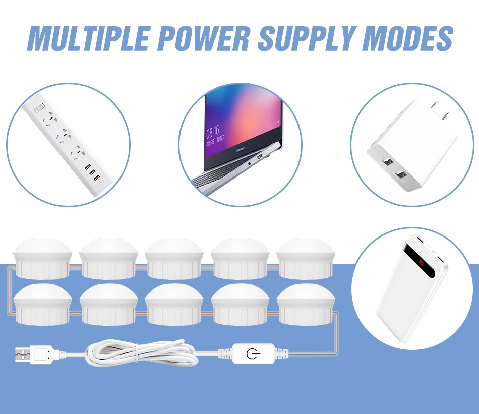 Советы:Лампочка светильник зеркала для макияжа поддерживает несколько режимов питания, но батарейки в комплект не входят.