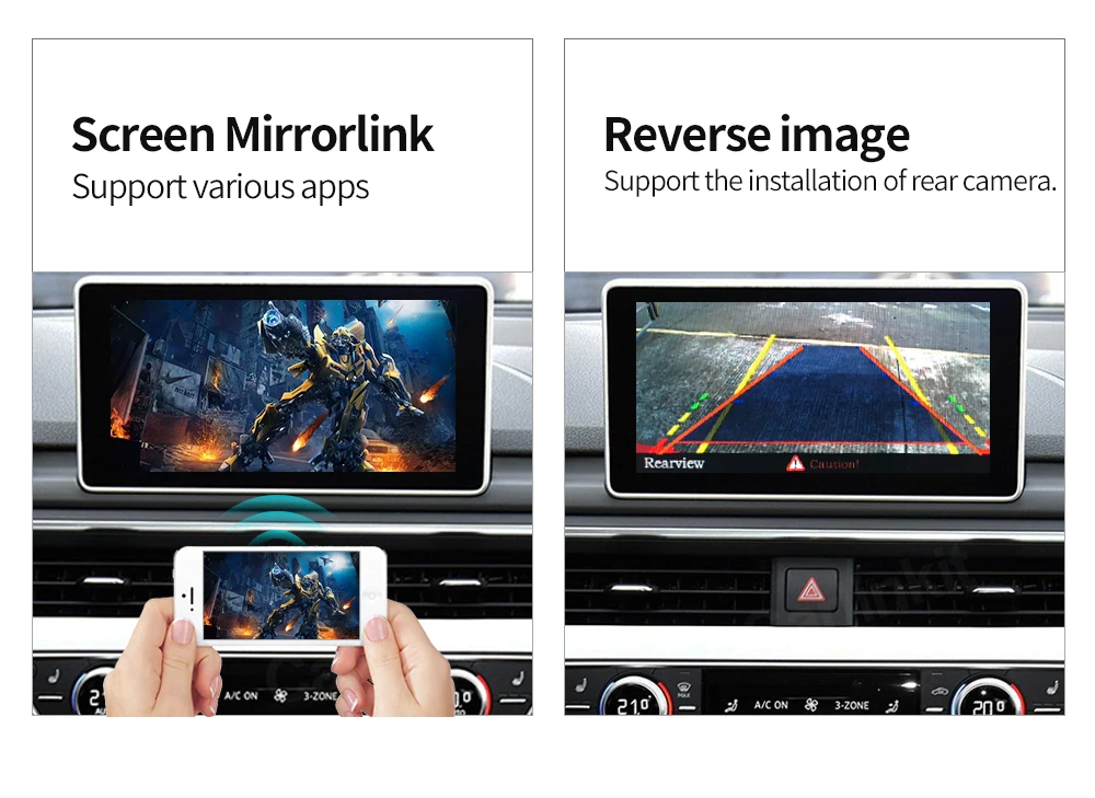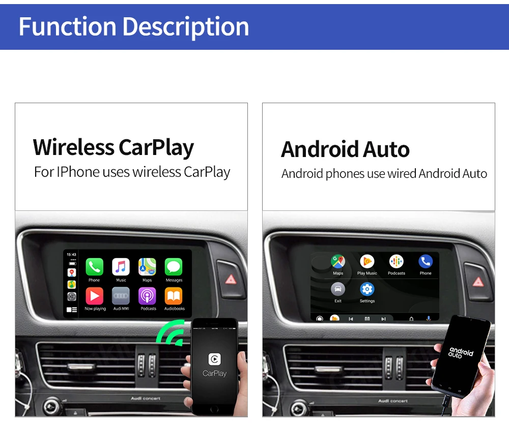 1. Работает с Apple CarPlay, сопряжение через Bluetooth, передача через WIFI.2. Работает с проводным CarPlay также, сначала выключите Wi-Fi, подключите через кабель освещения (проводное Удерживайте телефон одновременно)3.Android Mirroring-Link для телефонов Android (ссылка для скачивания)4.GPS навигационные приложения, Google Maps, Waze и Apple Maps доступны в режиме реального времени5. Музыка яблоки Spotify,Apple Music, Amazon и т. Д. Аудио через фабрику Audi media, текст на дисплее для некоторых приложений.6. Голосовое управление, говоря: "Эй, Сири...7.Aftermarket фронтальный/задний/360 вход камеры. (Поддерживаются динамические Направляющие линии)8.USB флэш-накопитель для воспроизведения музыки и видео с помощью подключения USB порта от CarPlay kit9. Регулировка эквалайзера. Лучшее качество звука. Выберите свой любимый стиль свободно (поп, рок, мягкий, стандартный ..)10. Полное управление кнопками OEM