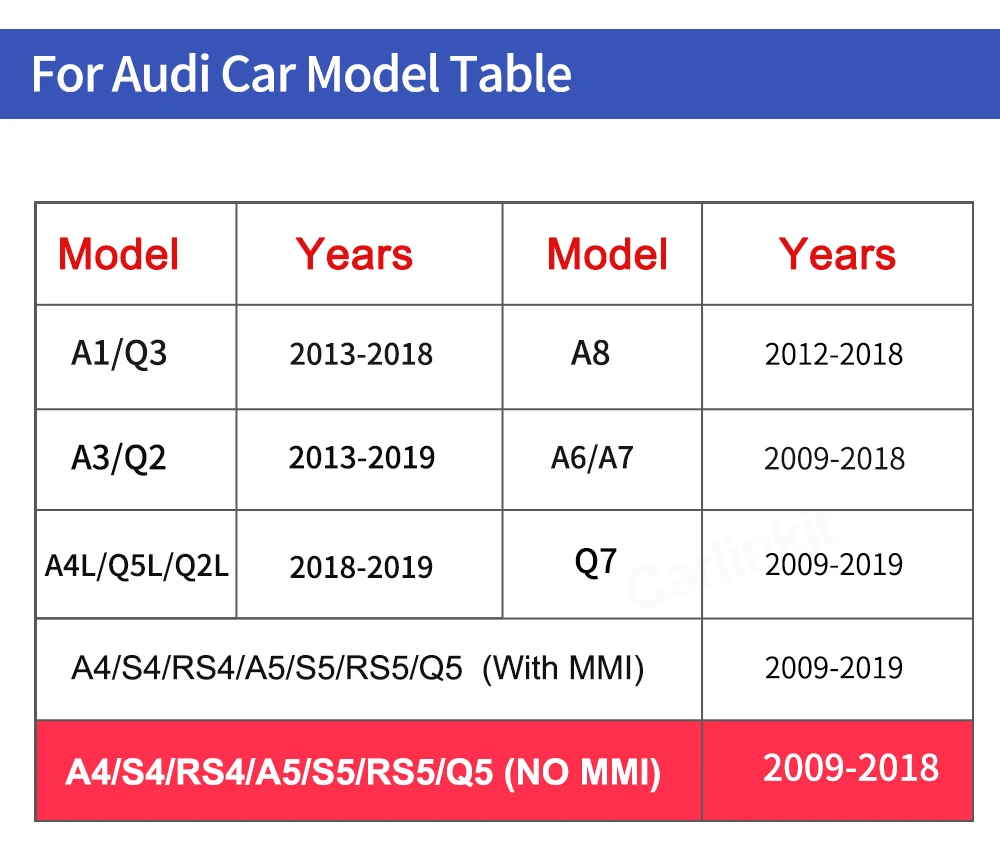 Carlinkit 2,0 декодер аксессуары Подходит для Audi A4 A5 S4 Q5 NON MMI для беспроводного Apple CarPlay Android автомобильный мультимедийный зеркальный комплект карта