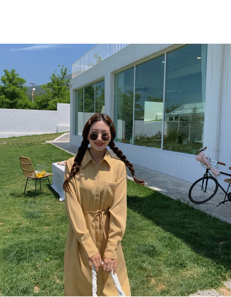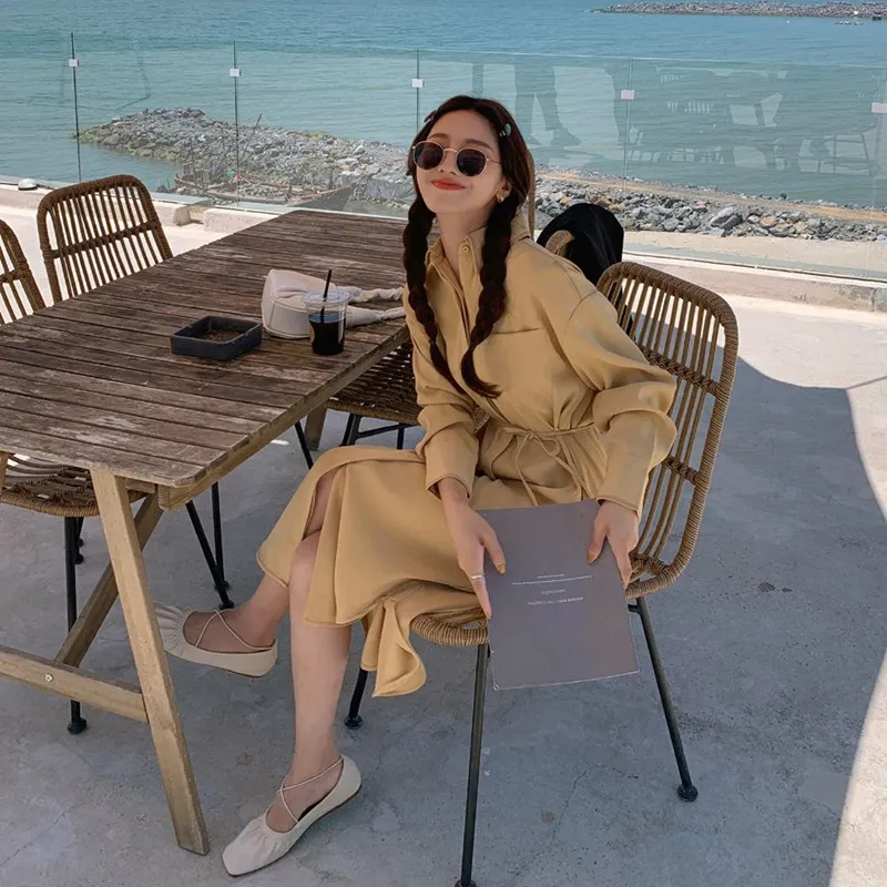 Винтажное осеннее желтое платье-рубашка FINEWORDS, Повседневное платье с отложным воротником и одной пуговицей, свободное уличное платье, корейские женские платья с длинным рукавом