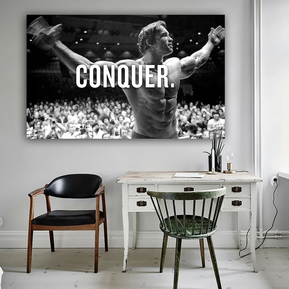 DDHH завоевывает Арнольд Шварценеггер, бодибилдинг Мотивационная Цитата Искусство Холст плакат печать 24x36inchWall картина для гостиной