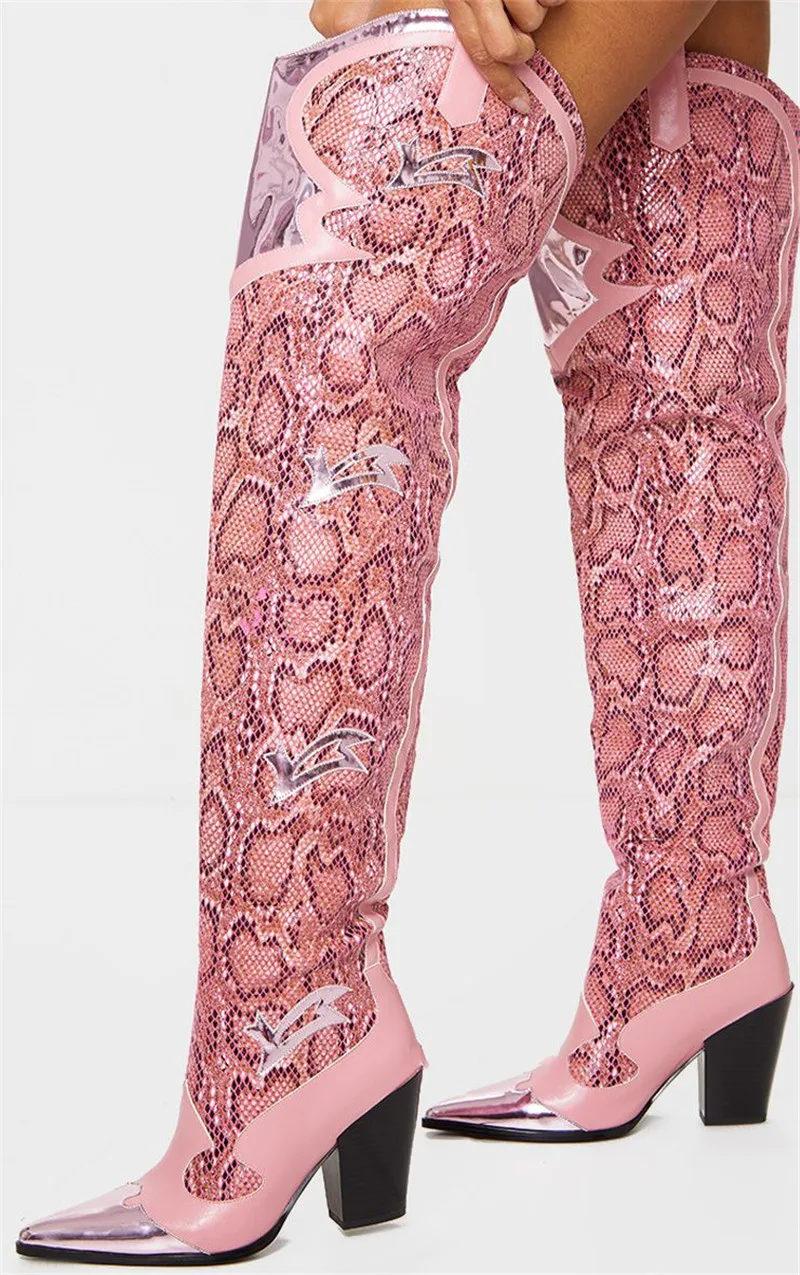 Сапоги женские из микрофибры, с острым носком, со змеиным принтом, на высоком каблуке, розовые, Осень-зима, 2021