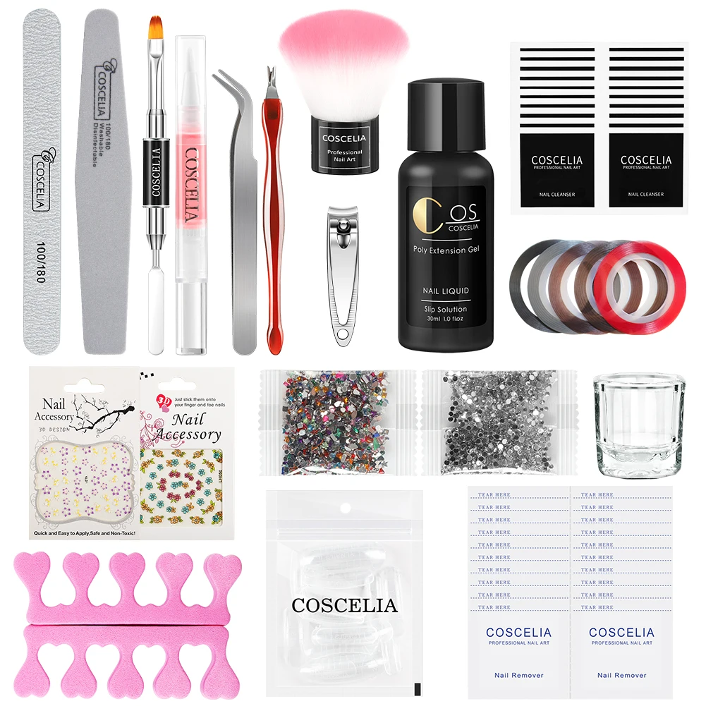 1x36W УФ светодиодный USB лампа6 /8x Гель-лакВерхнее пальто COSCELIA-1 шт.Базовое пальто COSCELIA-1 шт.1x15 мл полигель для ногтей50 x прозрачные накладные ногти10 x салфетки для удаления лака для ногтей10 чистящих салфеток2 x серые пилочки для ногтей1 x Смешанные цвета rhintones (около 1000 шт)1 x Серебряный ристон (около 1000 шт)5 x украшения для ногтей1 х двухсторонняя ручка из нержавеющей стали1 x щетка для пыли для ногтей1x Масло для кутикулы2 отделения для пальцев ног1 x машинка для стрижки кутикулы1 x вилка для кутикулы1 Изогнутый пинцет2 x наклейки для ногтейСтеклянная чашка-1 шт.