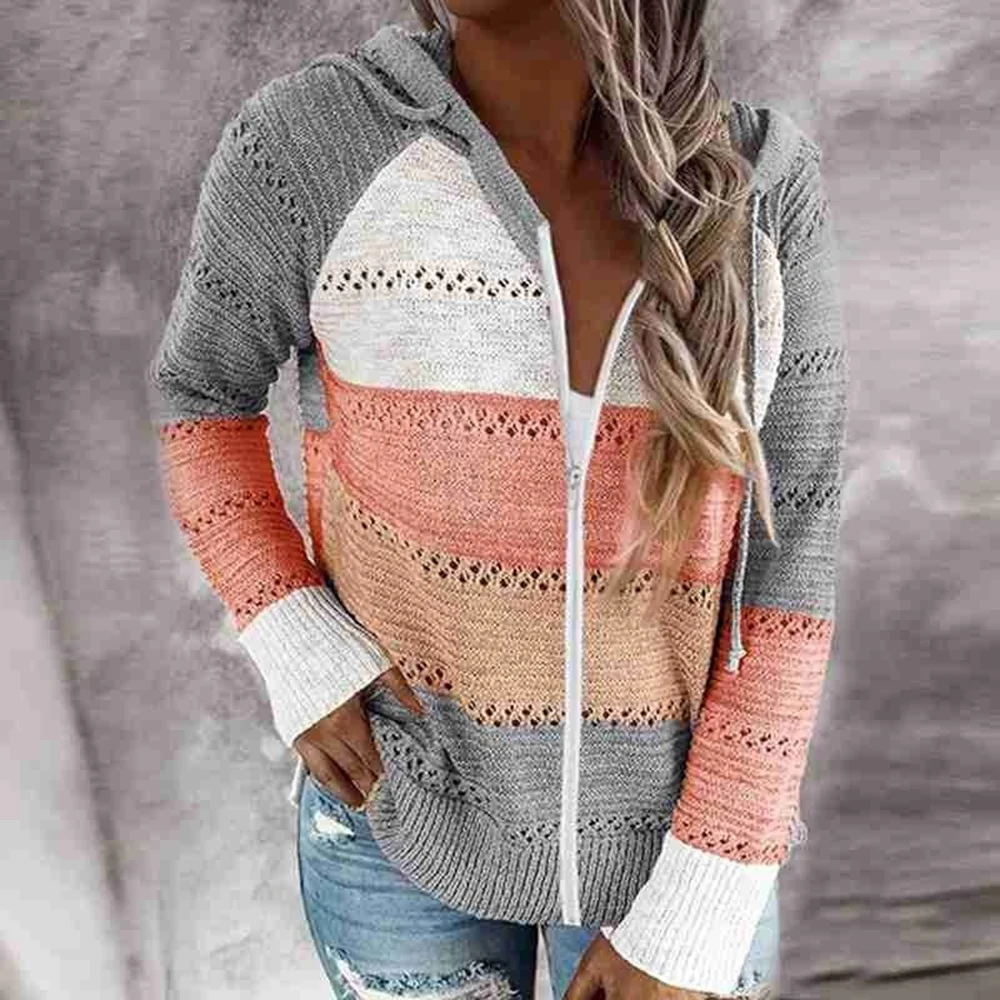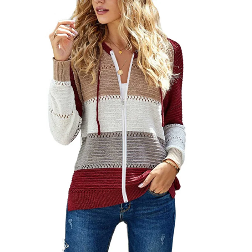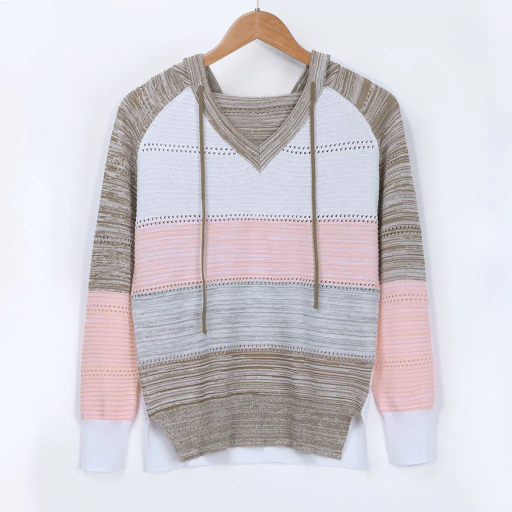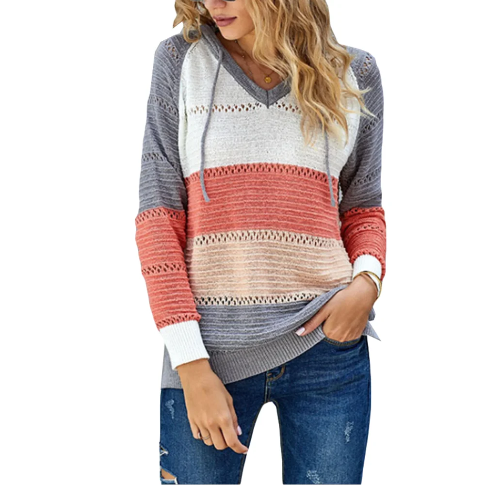 Женский ажурный свитер с капюшоном, Осенний пикантный полосатый лос...