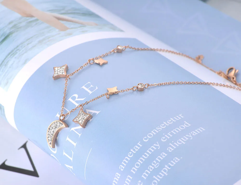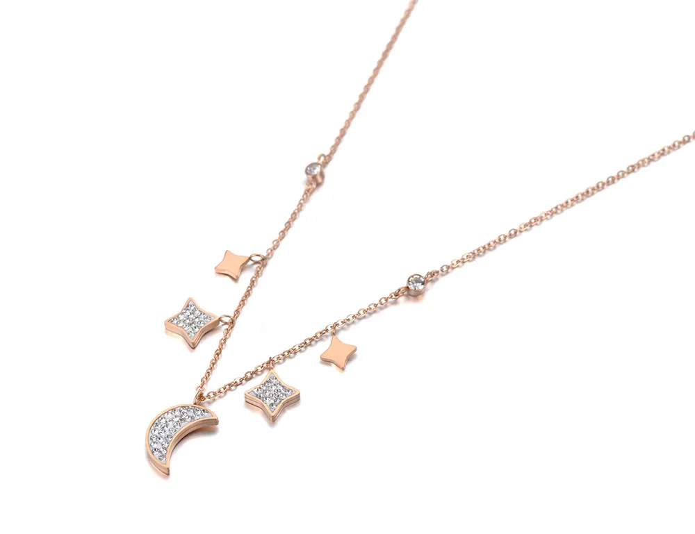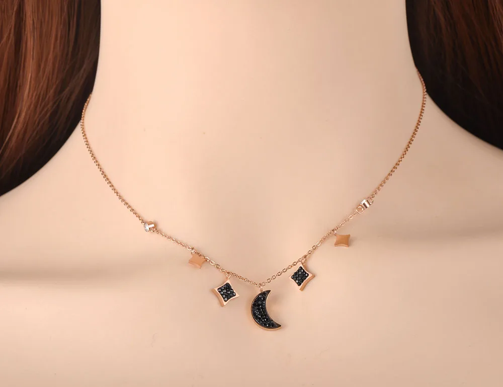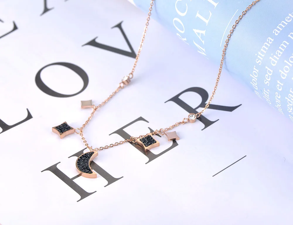 JeeMango винтажное ожерелье из нержавеющей стали CZ Хрустальная звезда Подвеска в виде Луны модное ожерелье-чокер для женщин JN19116