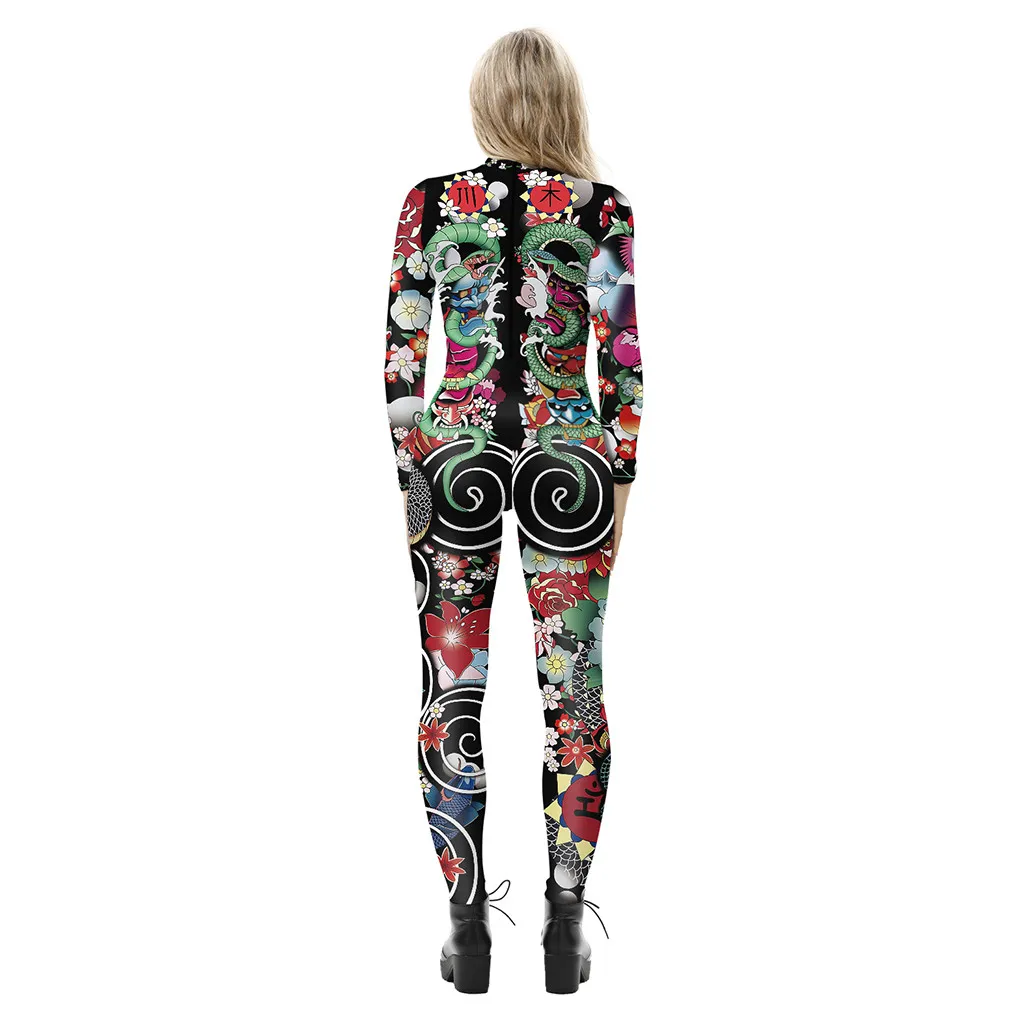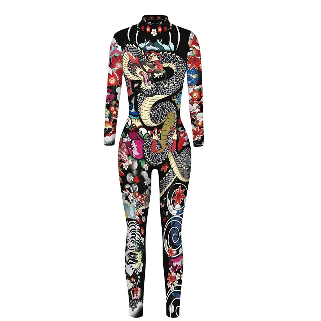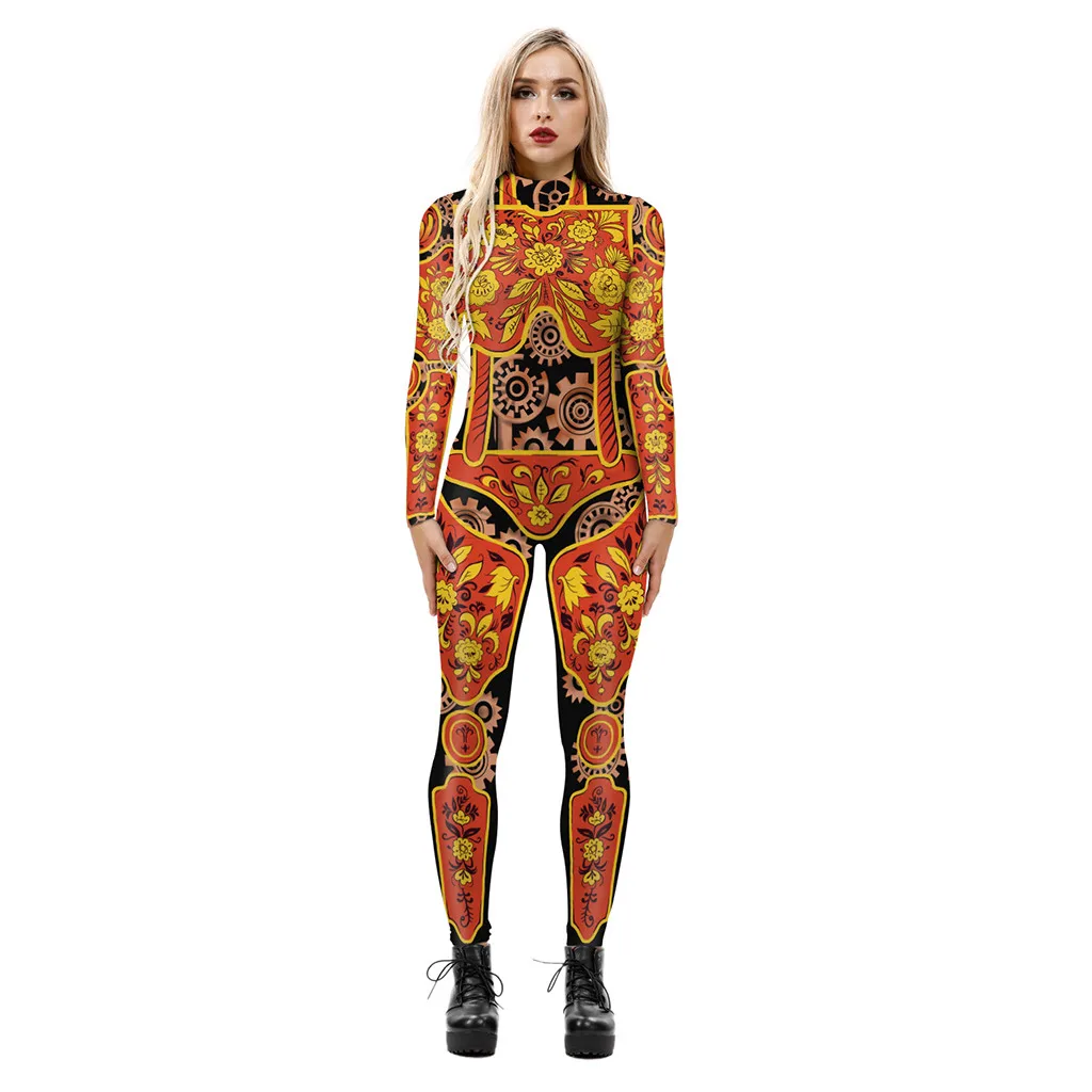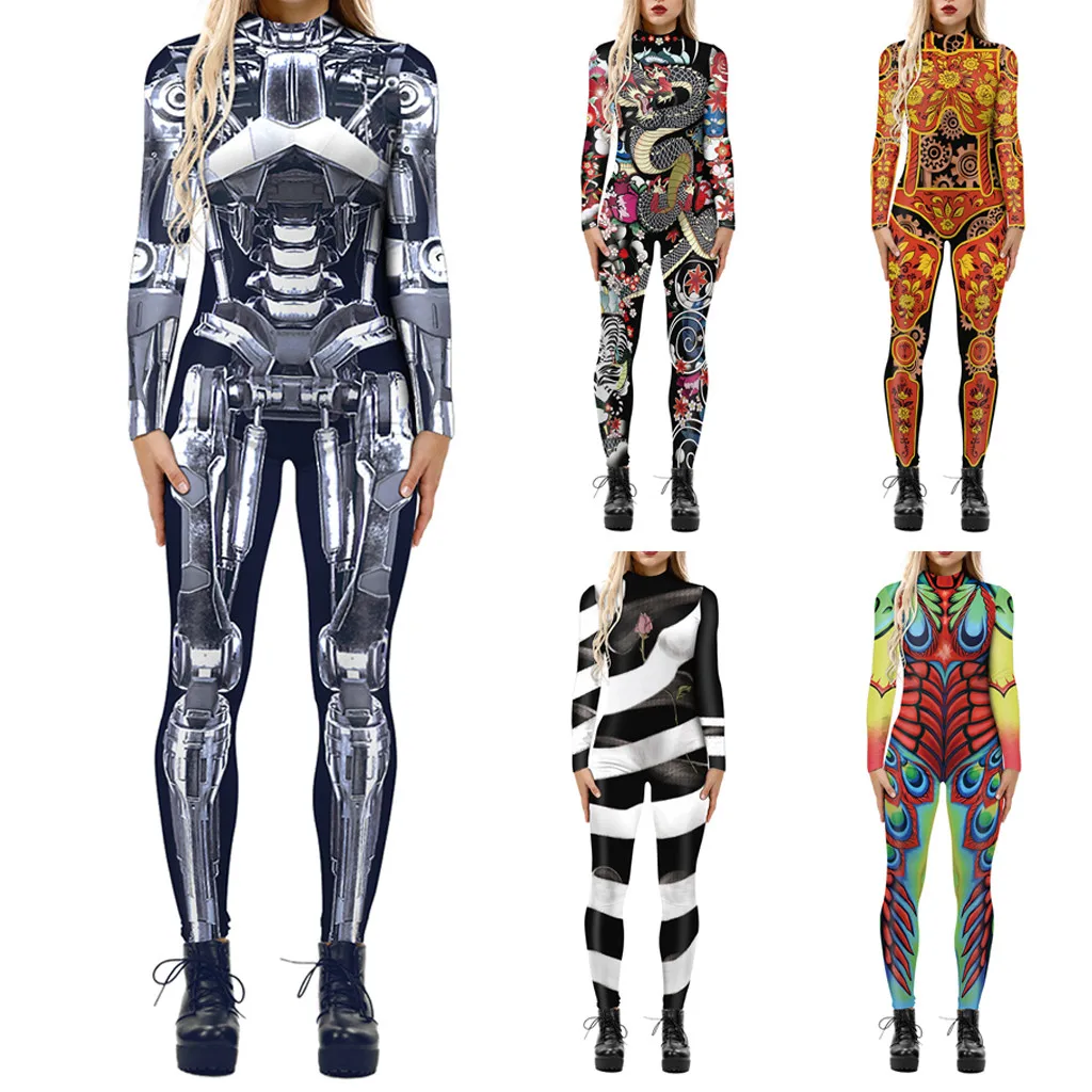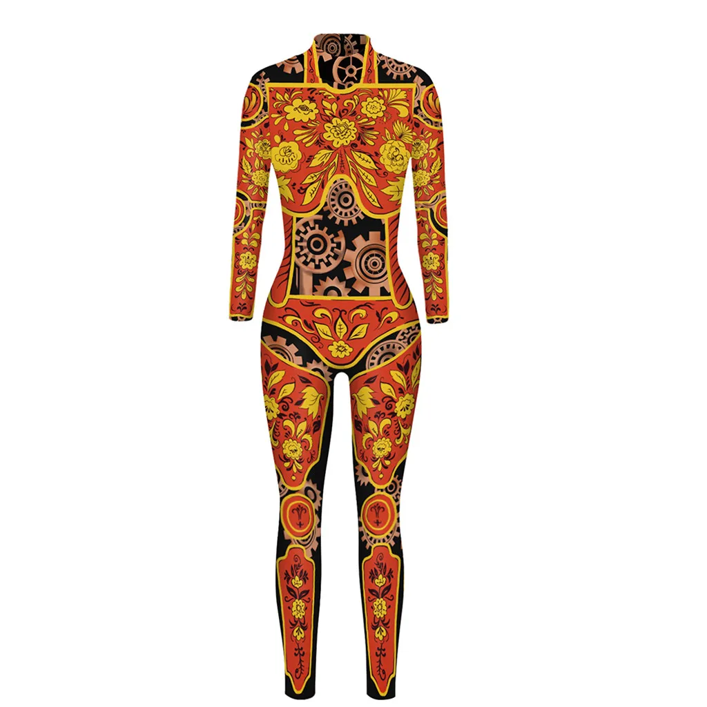 Женская мода Boho Хэллоуин печати с длинным рукавом Тонкий костюм на молнии комбинезон