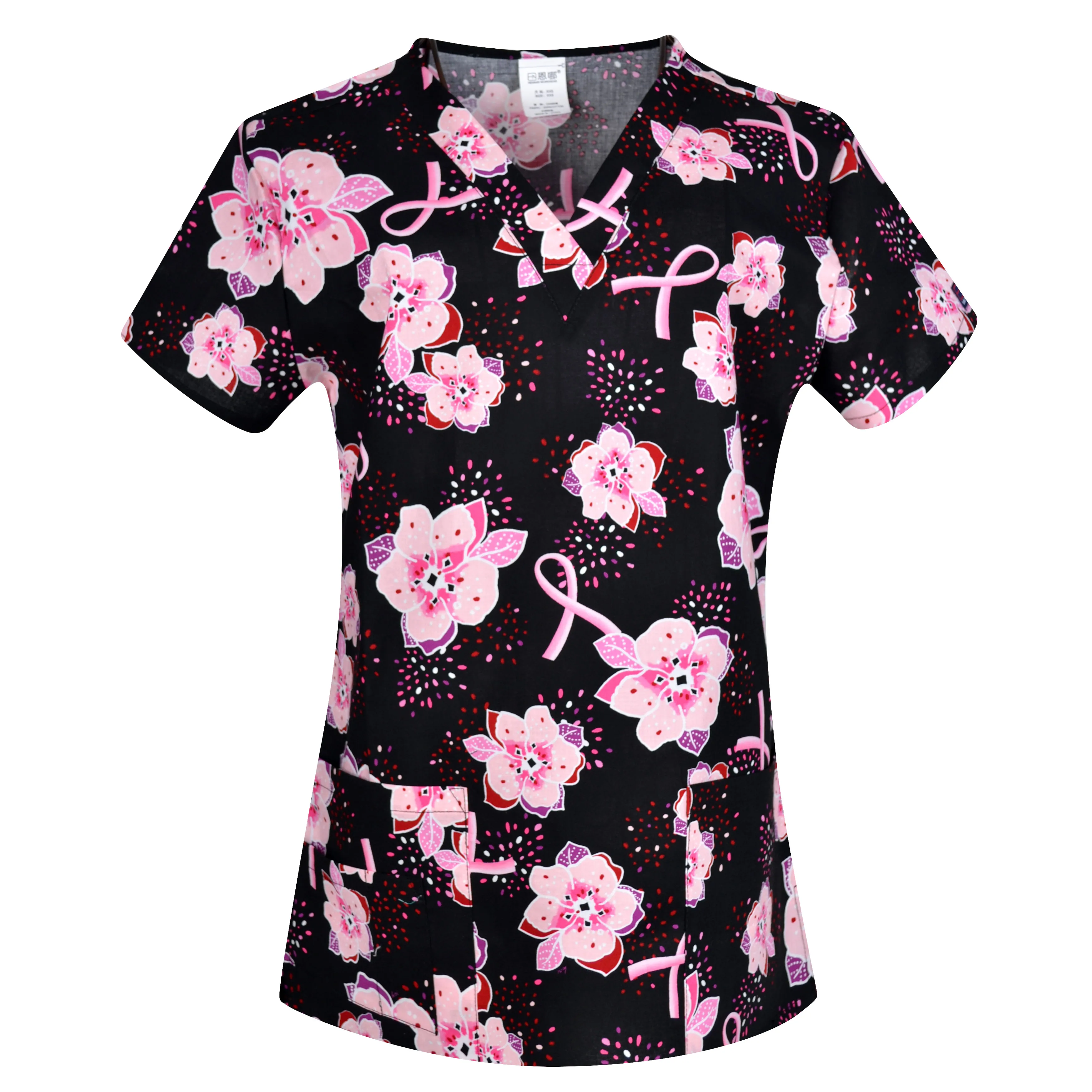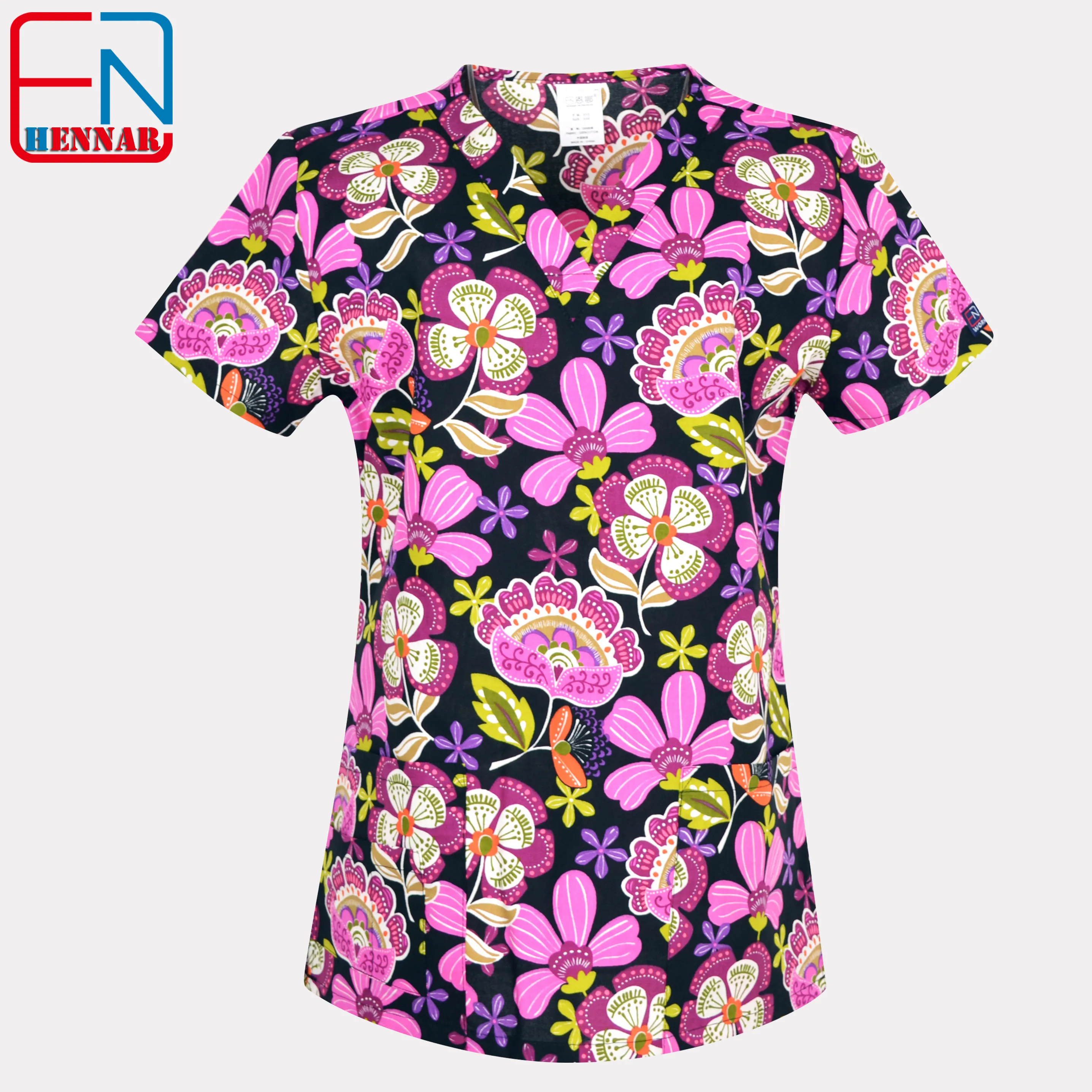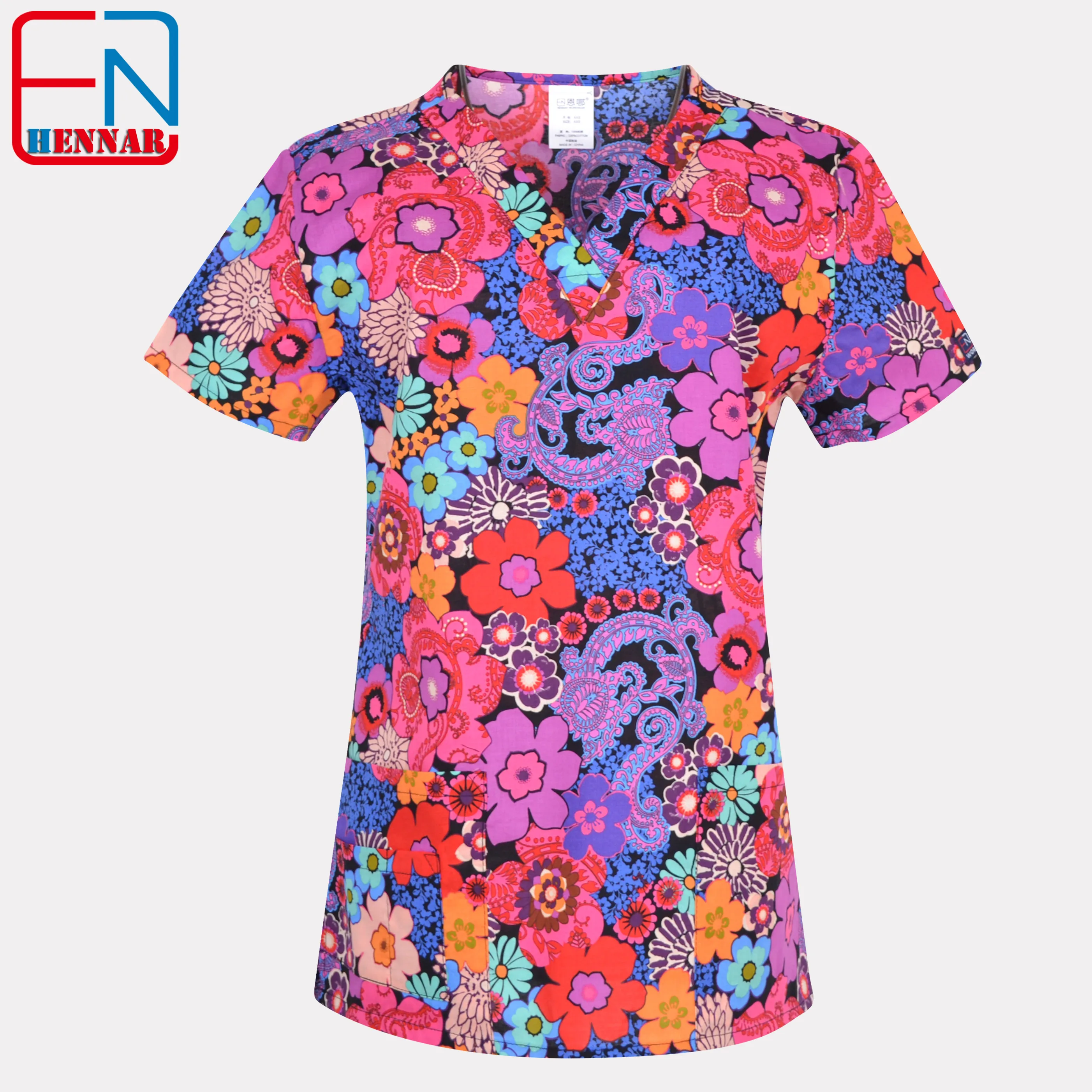 Hennar женский скраб-топ 100% принт хлопчатобумажная Униформа v-образный вырез короткий рукав XXS-3XL скрабы Топ