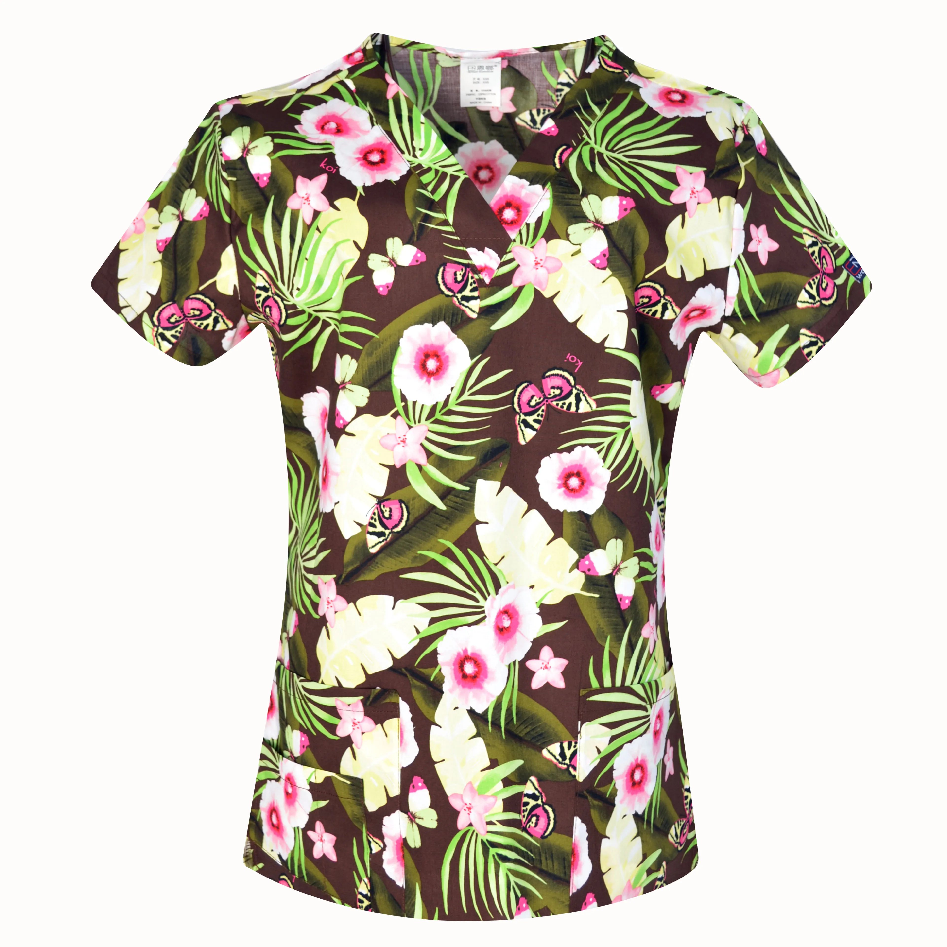Hennar женские скраб-топ 100% принт хлопчатобумажная униформа футболки с короткими рукавами и v-образной горловиной XXS-3XL Серия Бабочка с ажурной кромкой на верхней части