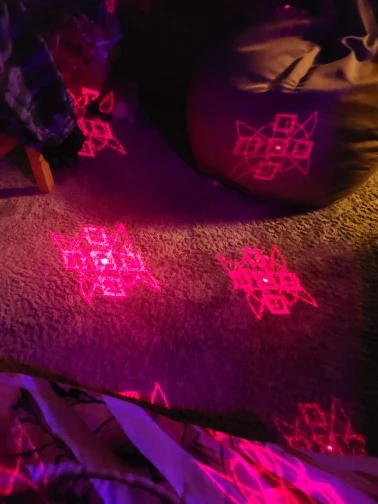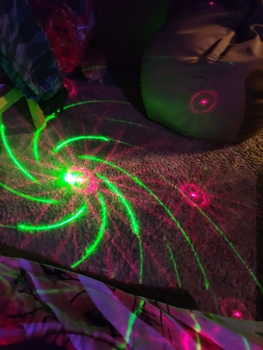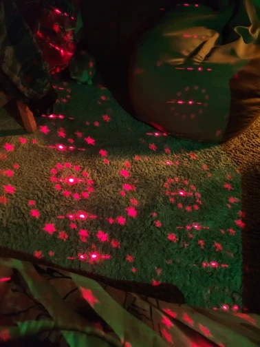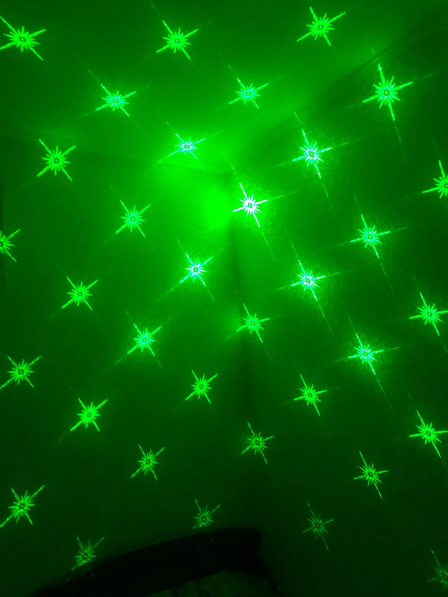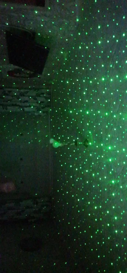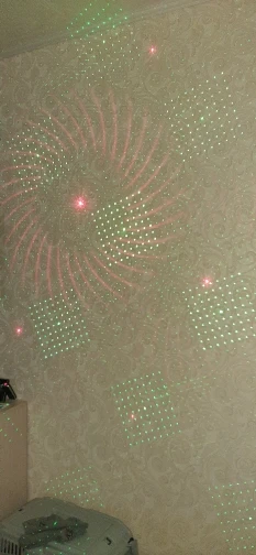Пока не разобралась толком, но светит. Думала, что сломан, так как 2 дырочки без стекла, но на картинке, вроде как так и есть... Кажется, что нет столько узоров, сколько заявлено, но ОЧЕНЬ красиво светит... Цвет красный и зелёный. В общем, надеюсь разберусь и смогу полностью оценить всю прелесть устройства.