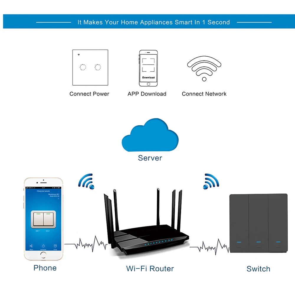 1. Smart Switch подключается к серверу через Wi-Fi и сообщает текущее состояние коммутатора, чтобы вы могли видеть реальный статус устройства на вашем смартфоне.2. Ваши команды управления загружаются на сервер через сеть телефона, и сервер передает команды управления на смарт-коммутатор. Переключатель запускает ваши команды включения или выключения.Пожалуйста, будьте уверены, что передача данных очень безопасна с помощью шифрования.