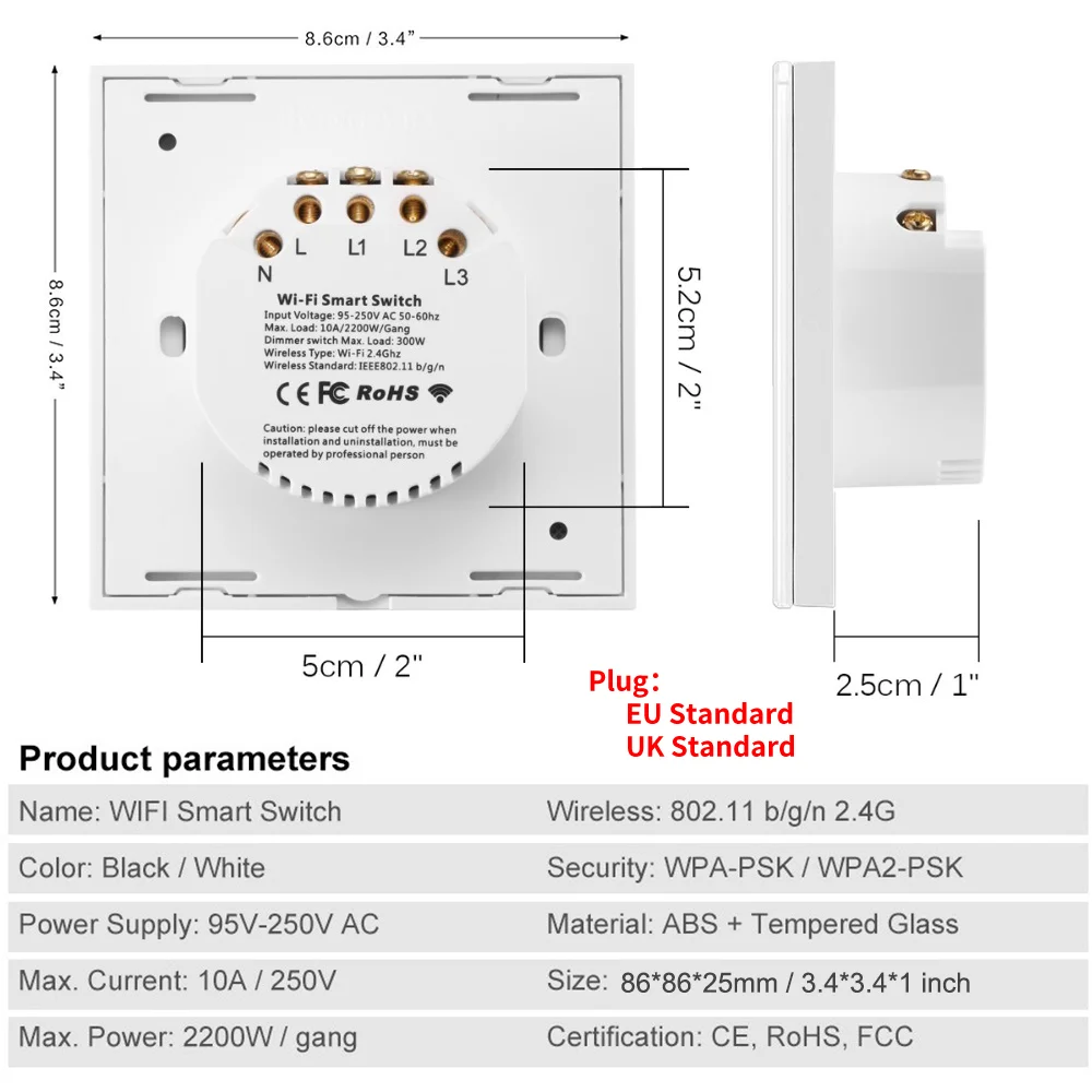 Тип: WiFi смарт-переключательМатериал: PC V0 огнеупорный + ABSЦвет изделия: белый/черныйФункция: Управление по Wi-Fi, Совместимость с Amazon Alexa Echo Google Home AssistantПитание: переменного тока для детей ростом 95-250V 50/60HzМаксимальный ток: 10A /250 В/gangМаксимальная мощность: 2000 Вт/комплектРабочая температура: -10 ℃-45 ℃ (14 ℉- 113 ℃)Рабочая влажность: ≤ 80%Бесплатное приложение: Tuya SmartЕС/Великобритания Размеры: 86*86*35 мм (3,4*3,4*1,4 дюймов)Wi-Fi Тип: 2,4 ГГц 802.11b/g/nСертификация: CE, RoHS, FCC