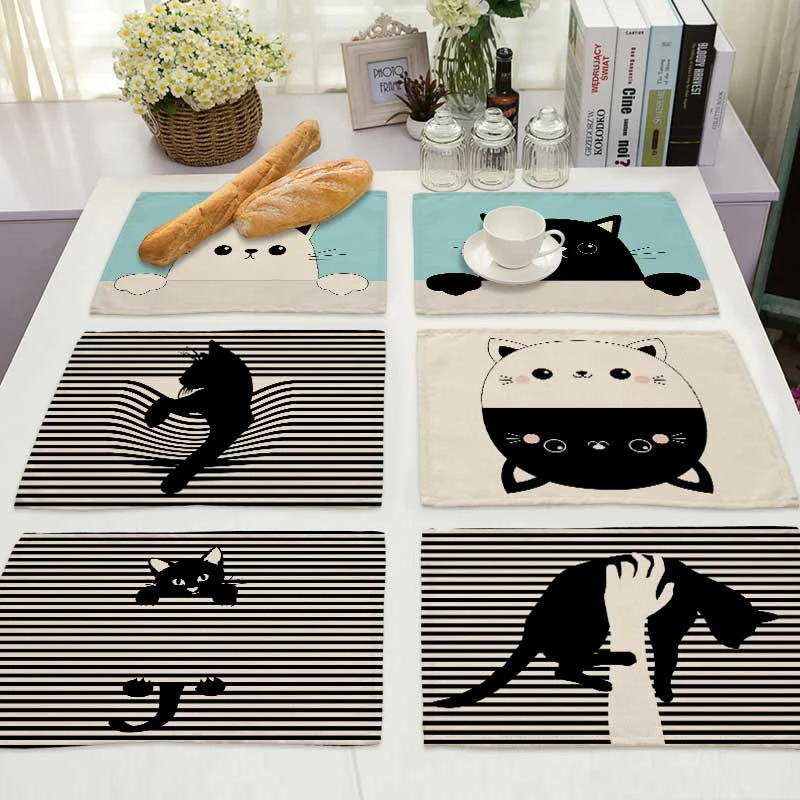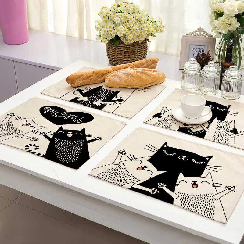 Bkack симпатичный котик узор хлопковая льняная подкладка коврики для обеденного стола 42*32 подставка под чашку для пикника кухонная подставка домашний декор ML0016